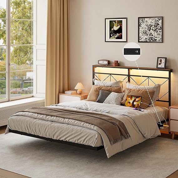 Full Size Floating Bed Frame with Storage Headboard Metal Platform Bed Frame
