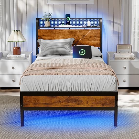 Full Bed Frame with LED Lights,Industrial Storage Headboard
