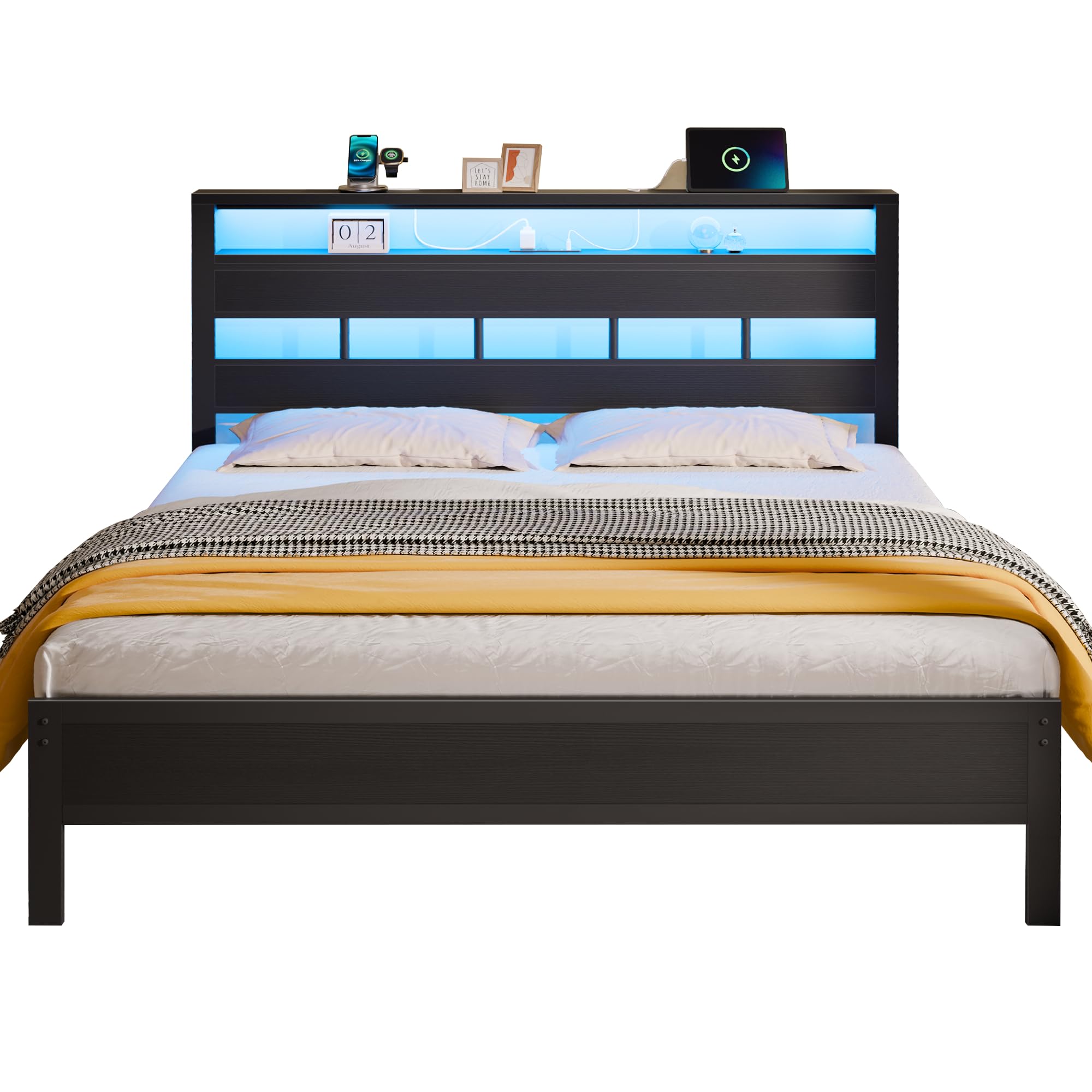 Queen Bed Frame with Storage Headboard and LED Lights, Metal Bedframe
