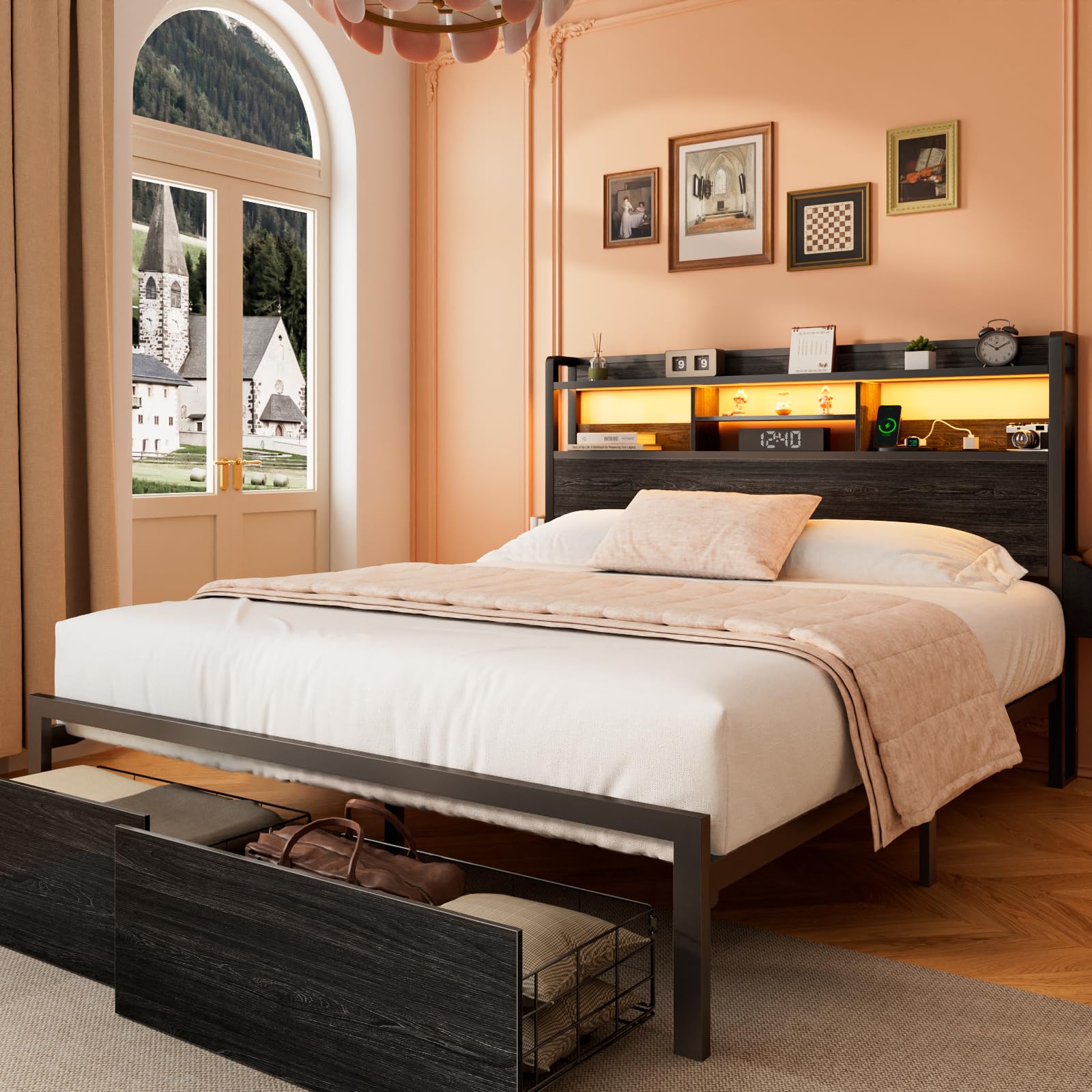 - The Furnulem Queen Bed Frame not only offers a spacious sleeping area, but also features a convenient storage shelf with a built-in charging station that includes 2 AC outlets and 2 USB ports. This innovative design allows you to keep your devices within reach while providing ample space for books, Earphones, mobile phones, decor, and other essentials.