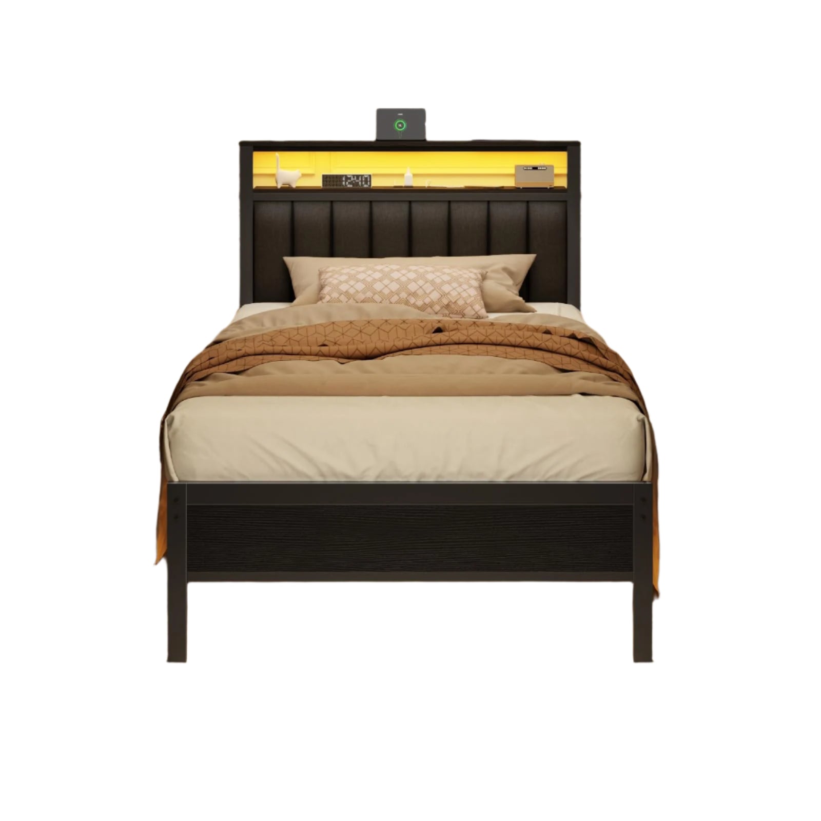 - With 2-tier storage shelf on headboard, you can easily keep common small items such as phones, glasses, and books within easy reach. Enjoy a neat and organized sleeping space without compromising on functionality. Enhance your bedroom organization with our twin size bed frame featuring under-bed storage. This convenient hidden space provides ample room for storing suitcases, organizers, and other items.