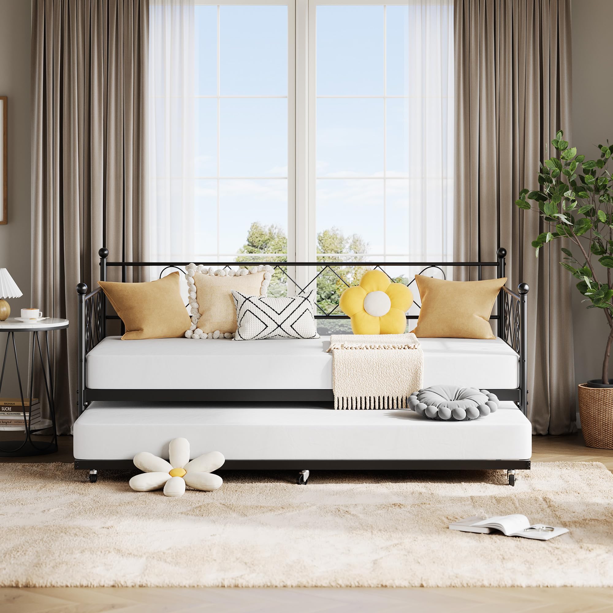 - Crafted from high-quality metal, this daybed boasts a sturdy and durable frame that supports a substantial weight capacity. Say goodbye to wobbly furniture. The robust construction ensures long-lasting use and stability, allowing you to relax and sleep peacefully without any concerns about wear and tear.