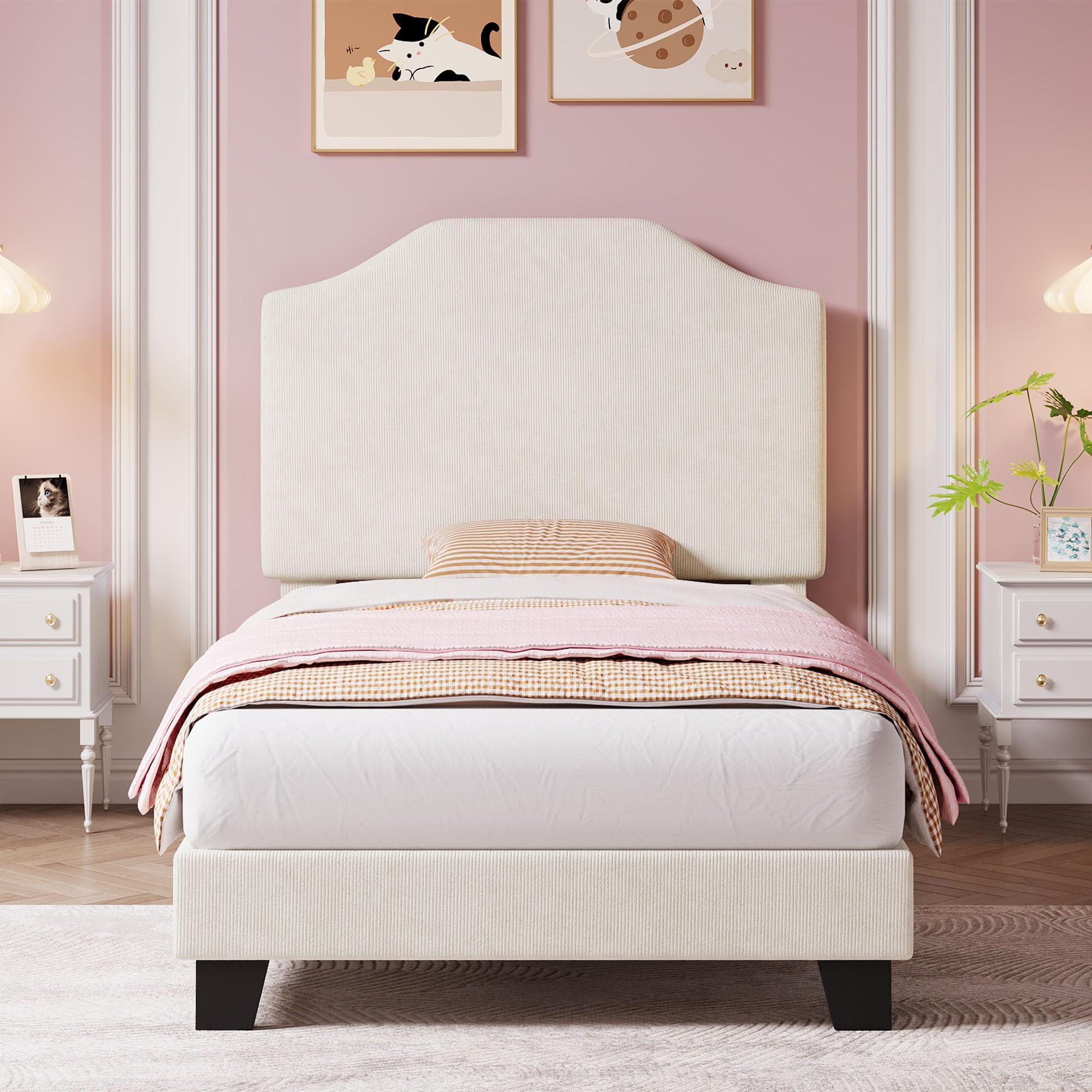 - [Velvet Upholstered Headboard]This twin bed frame includes a soft beige velvet headboard with a smooth, cushioned texture, designed for kids’ rooms. The neutral-toned fabric provides a versatile aesthetic, offering supportive comfort during bedtime or relaxation, while easily complementing diverse bedroom decor
