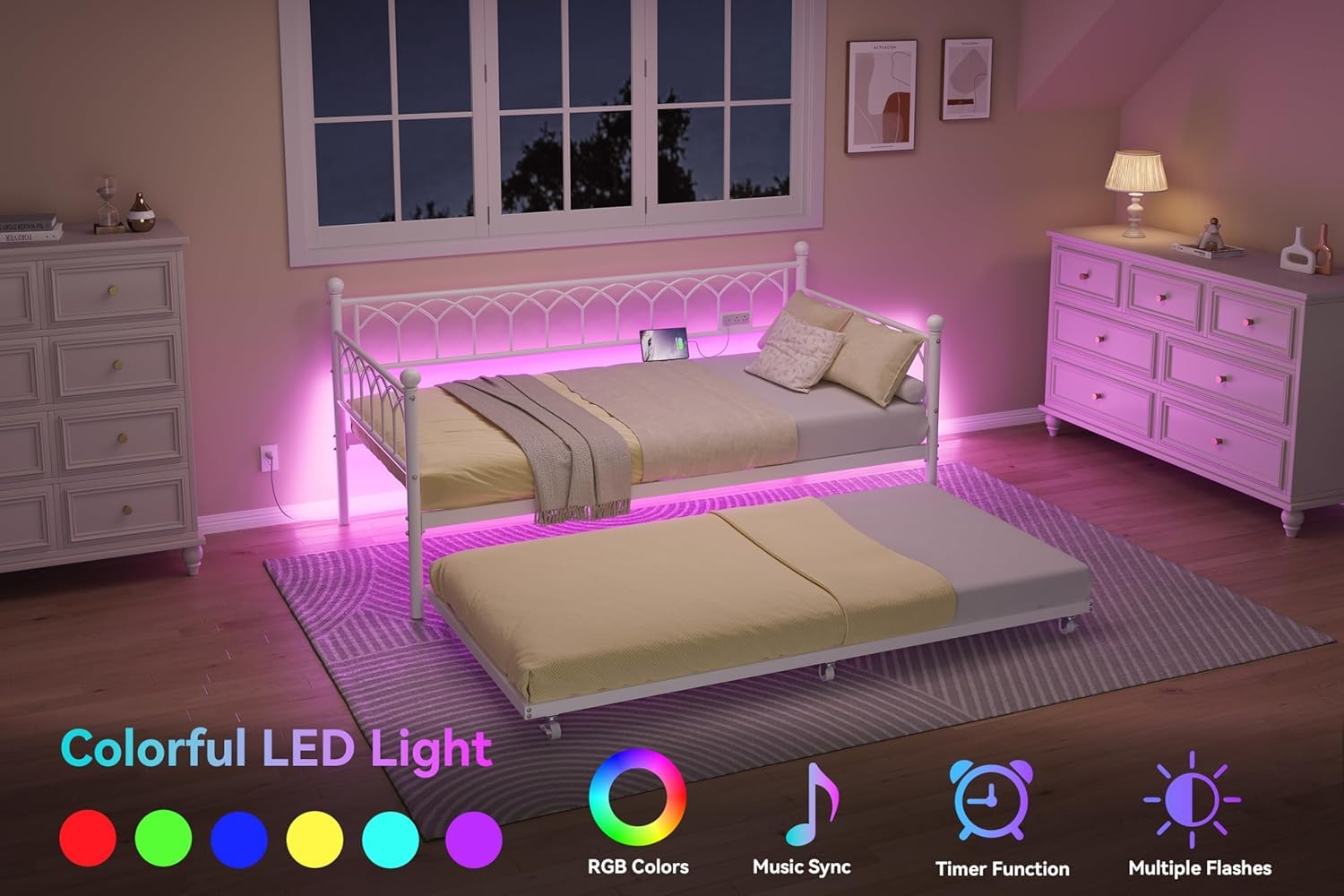 GAOMON Twin Size Daybed Frame with Trundle, Heavy Duty Metal Platform Sofa Bed Frame with Charging Station and LED Lights for Small Spaces, Living Room, Bedroom, Apartment - White