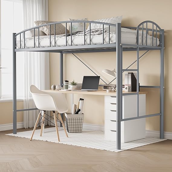 - Built with sturdy steel slats and a V-shaped support system, this metal loft bed frame holds up to 350 lbs without wobbling. No box spring needed—place your mattress directly on the durable slats. Engineered for long-lasting performance, it supports both children and grown-ups effortlessly.