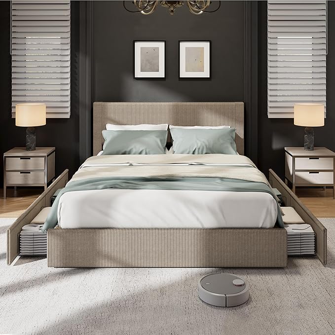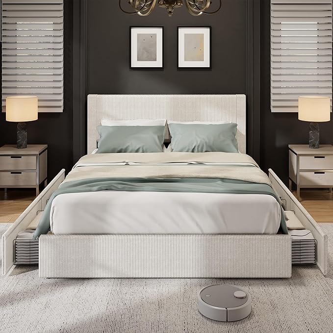 Bed Frame, Queen Size Platform Bed with 4 Storage Drawers