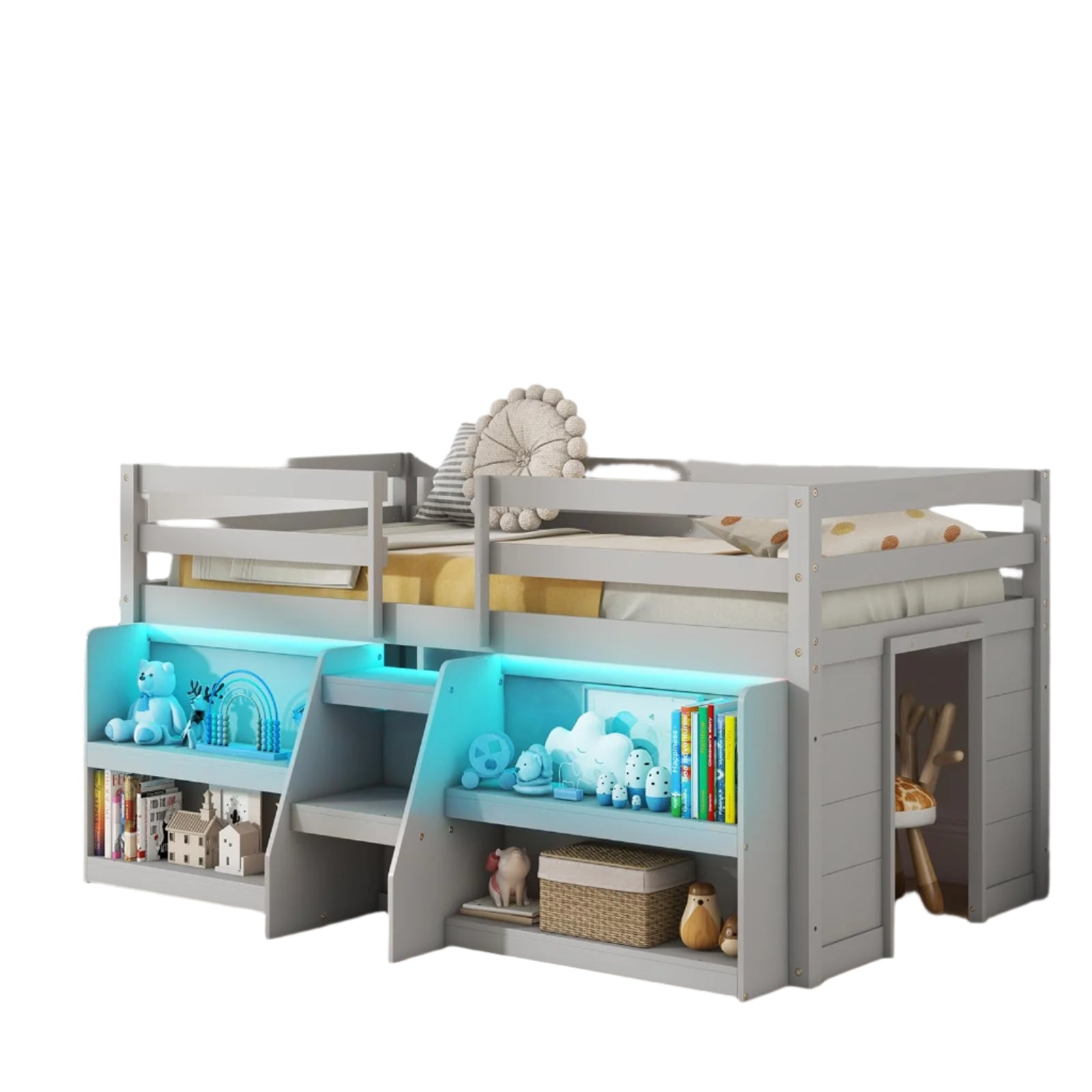 Low Loft Bed with LED Lights, Wooden Loft Bed Twin Size with Stairs & Safety Guardrail