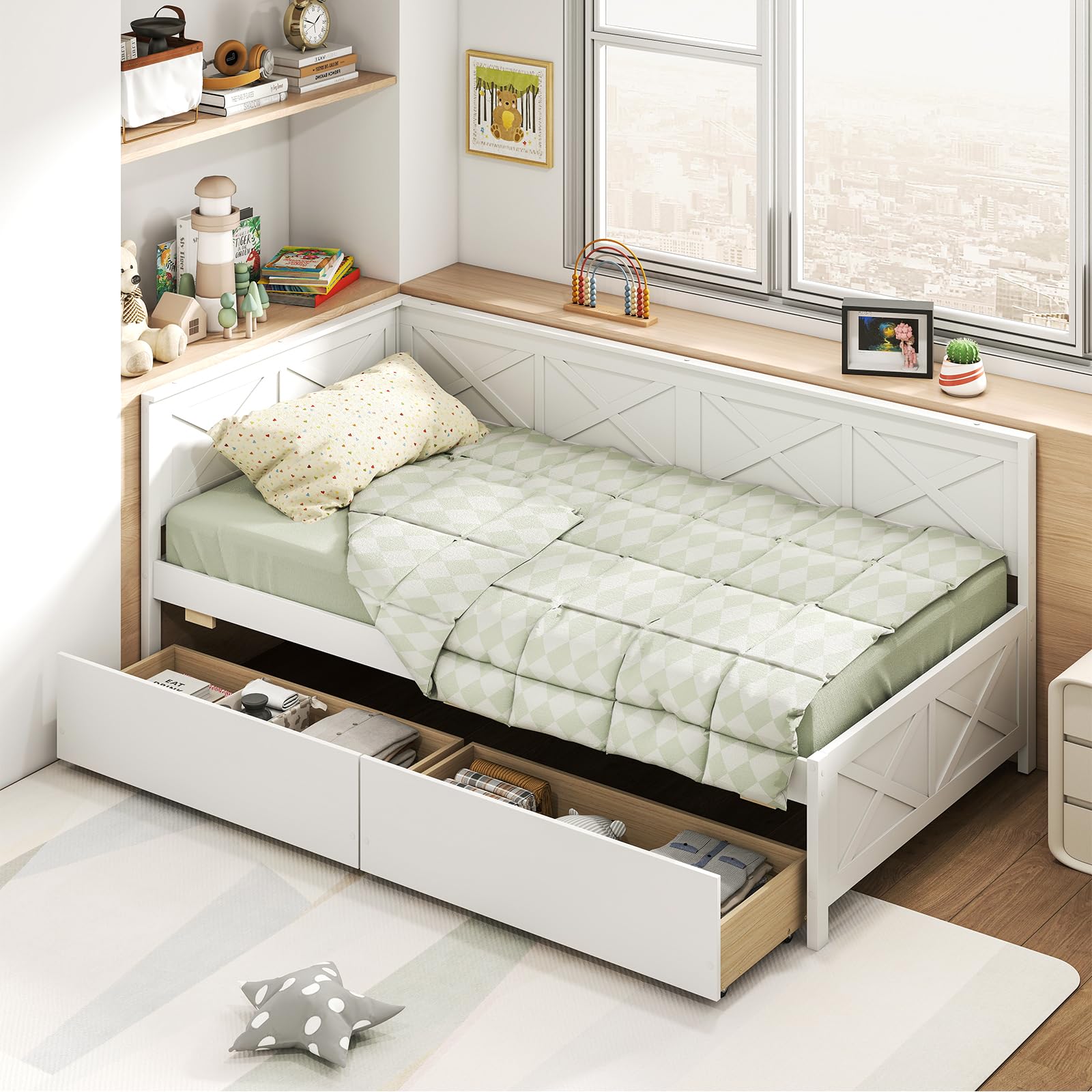 - Practical Storage Drawers: The twin daybed features 2 large drawers that offer a convenient solution for organizing essentials such as linens, clothing, and bedding. Each drawer is equipped with wheels for easily sliding in and out.