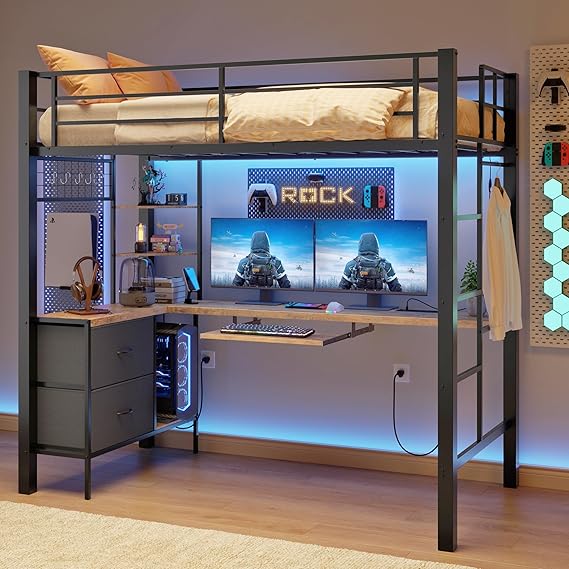 - Space-Saving Loft Bed with L-Shaped Desk & Outlets: Ultimate Work & Sleep Combo for Small Spaces. 56.5" under-bed clearance fits a L-Shaped study desk (64.6" + 40.9" workspace, holds 150 lbs) + gaming setup. No cramped corners—maximize your space! Built-In Charging Station – 2 outlets + 2 USB ports power laptops/phones (no tripping over cords!). Perfect for gamers, WFH pros & students