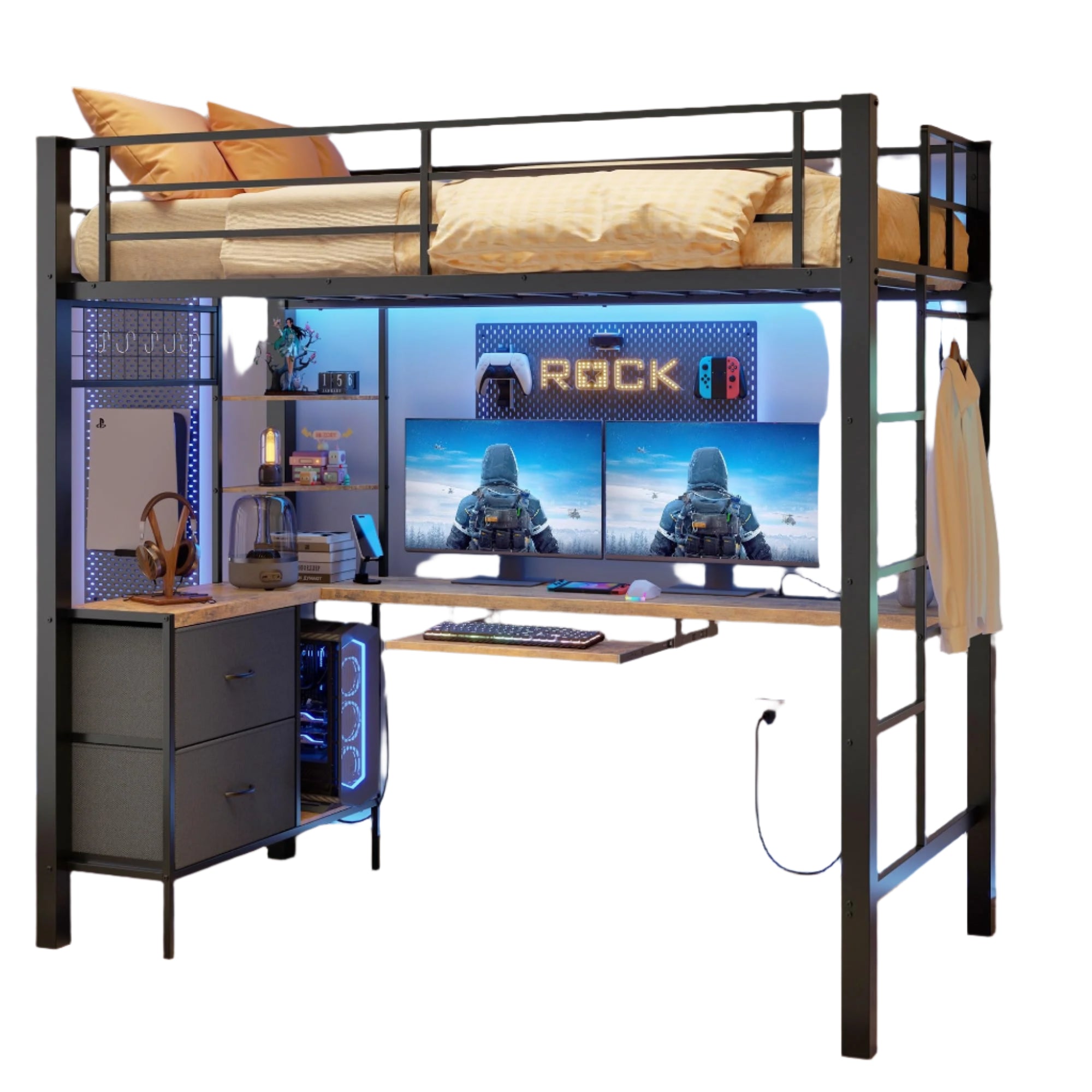 Twin Loft Bed with L-Shaped Desk and LED Lights, Charging Station