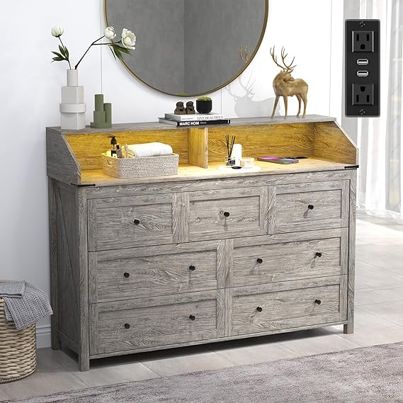 - SPECIAL DESIGN: This 7-drawer chest features a unique and captivating design. The addition of different colored LED lights creates an enchanting atmosphere, instantly transforming any space. With 2 AC sockets and 2 USB ports, it offers convenient charging options for your various devices. The wood rustic chest of drawers with wood texture exudes a charming retro vibe, adding a touch of nostalgia and elegance to your home decor
