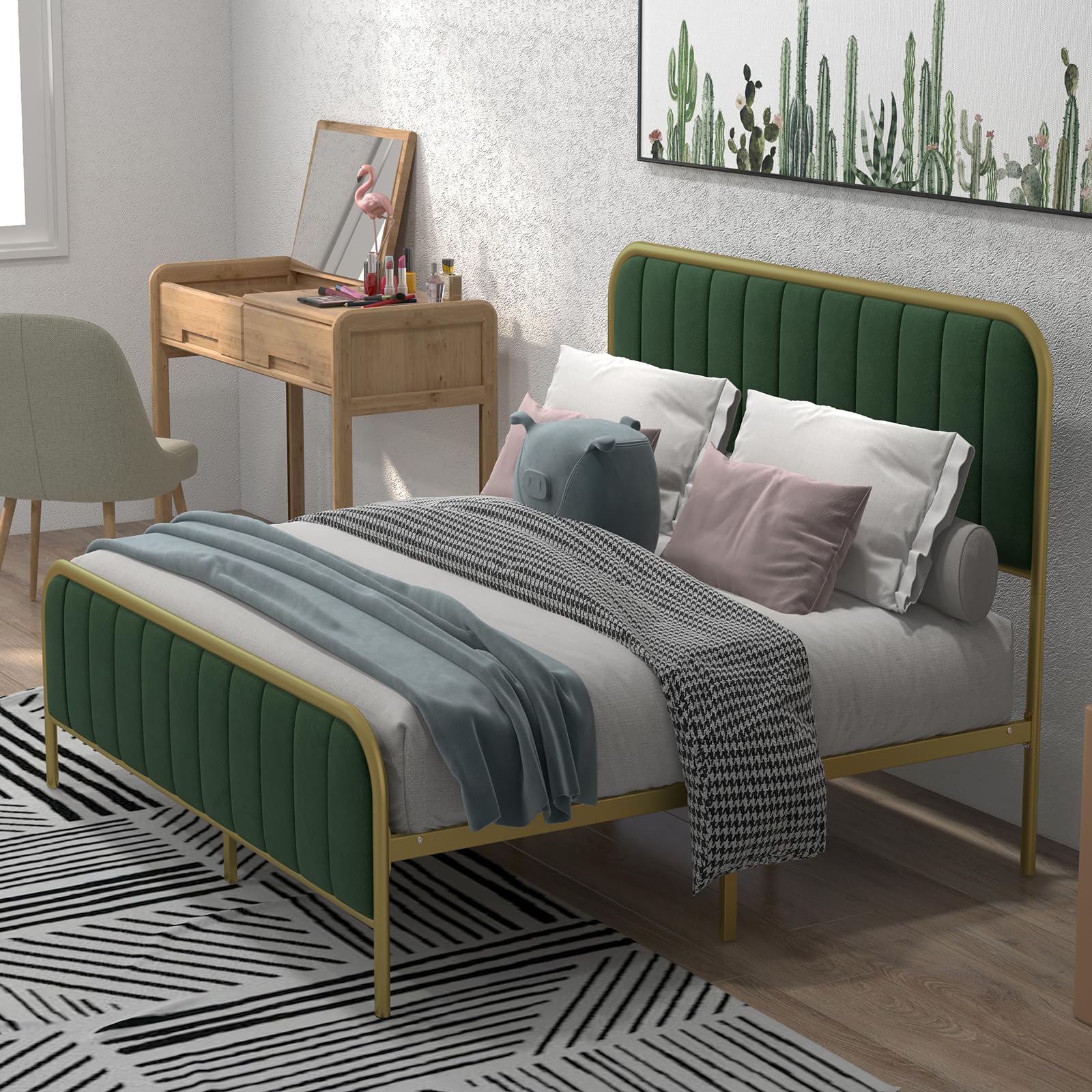 Full Size Bed Frame, Full Bed Frame with Velvet Headboard & Footboard
