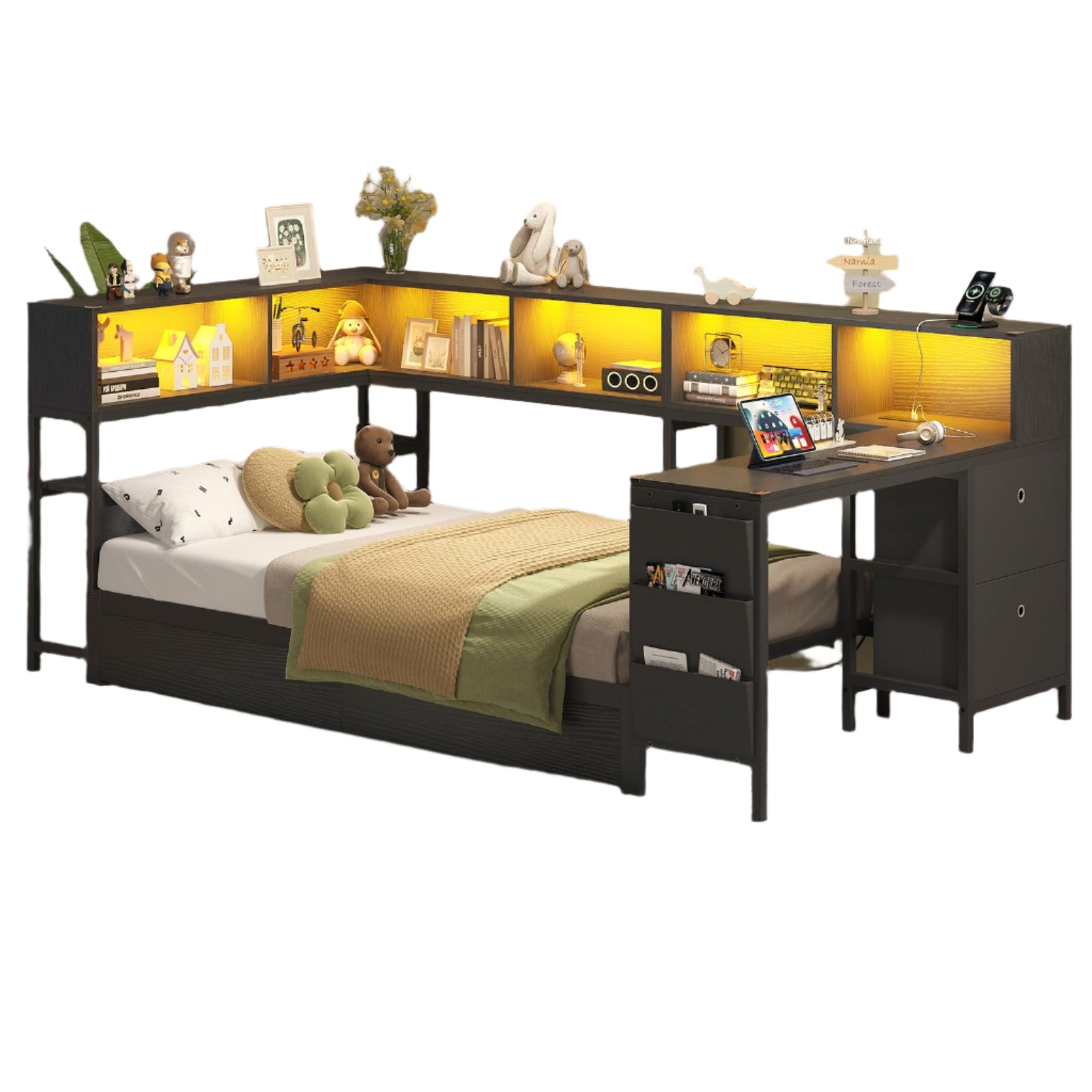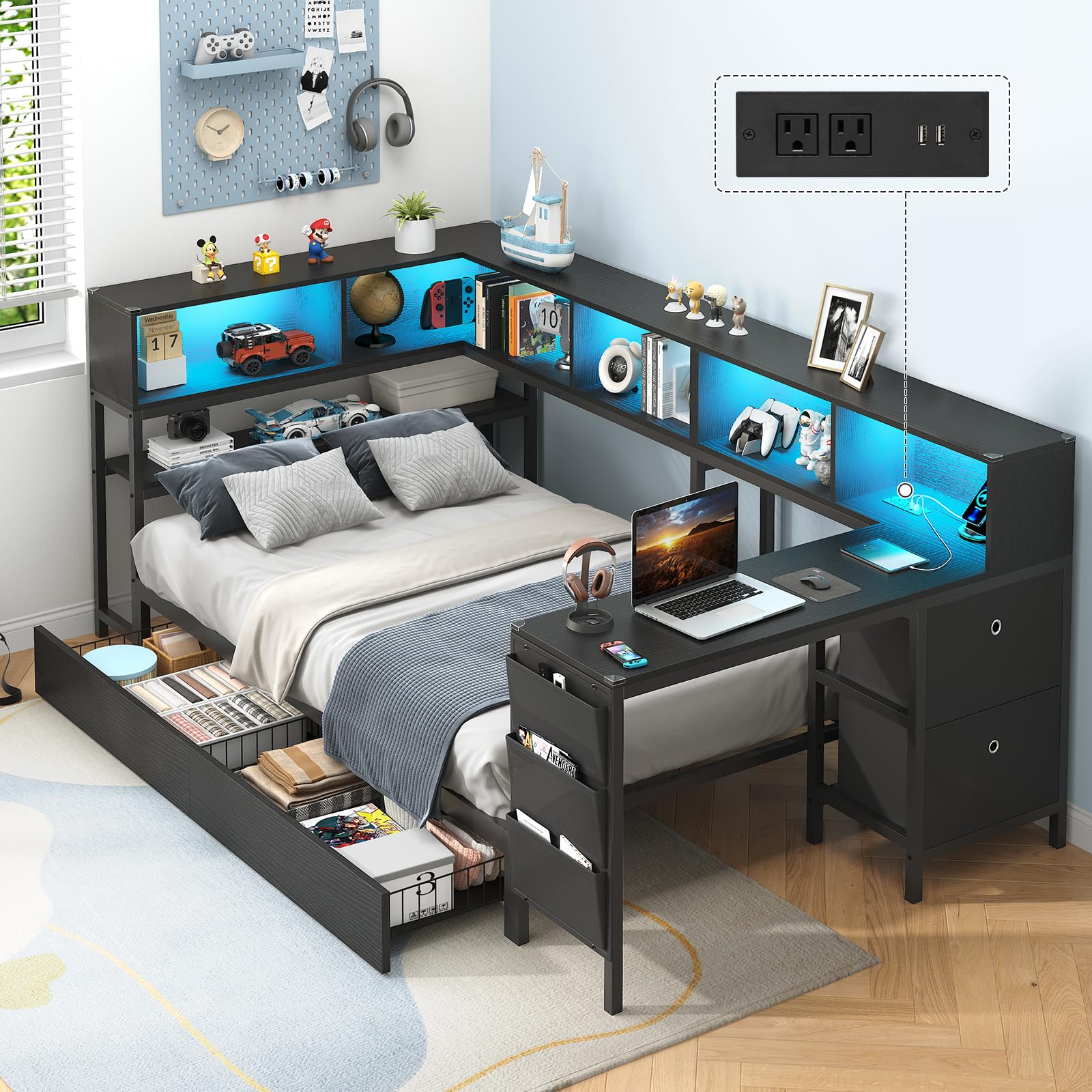 - This innovative corner bed frame is designed for ultimate practicality, featuring 6 built-in bookshelves perfect for books, magazines, and files. 2 under-bed drawers plus 2 versatile fabric bins for clothes, shoes, and blankets. The 2-tier headboard shelves and top storage ledge keep toys, alarm clocks, and glasses within easy reach. 3 side organizer pockets neatly hold magazines, remotes, storybooks. Maximize the bedroom space and keep the room clean and tidy.