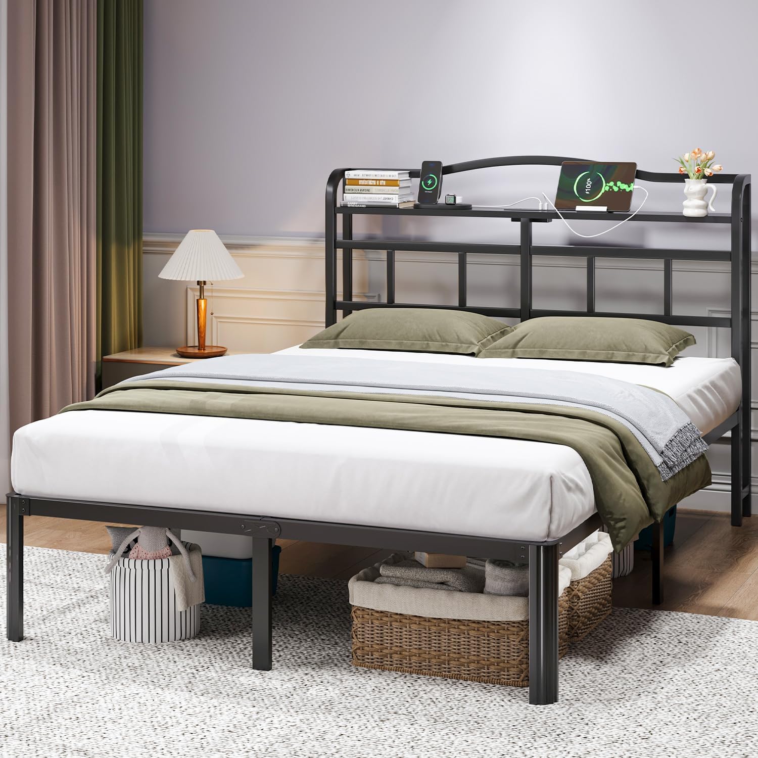 Full Size Bed Frame - Storage Headboard with Charging Station