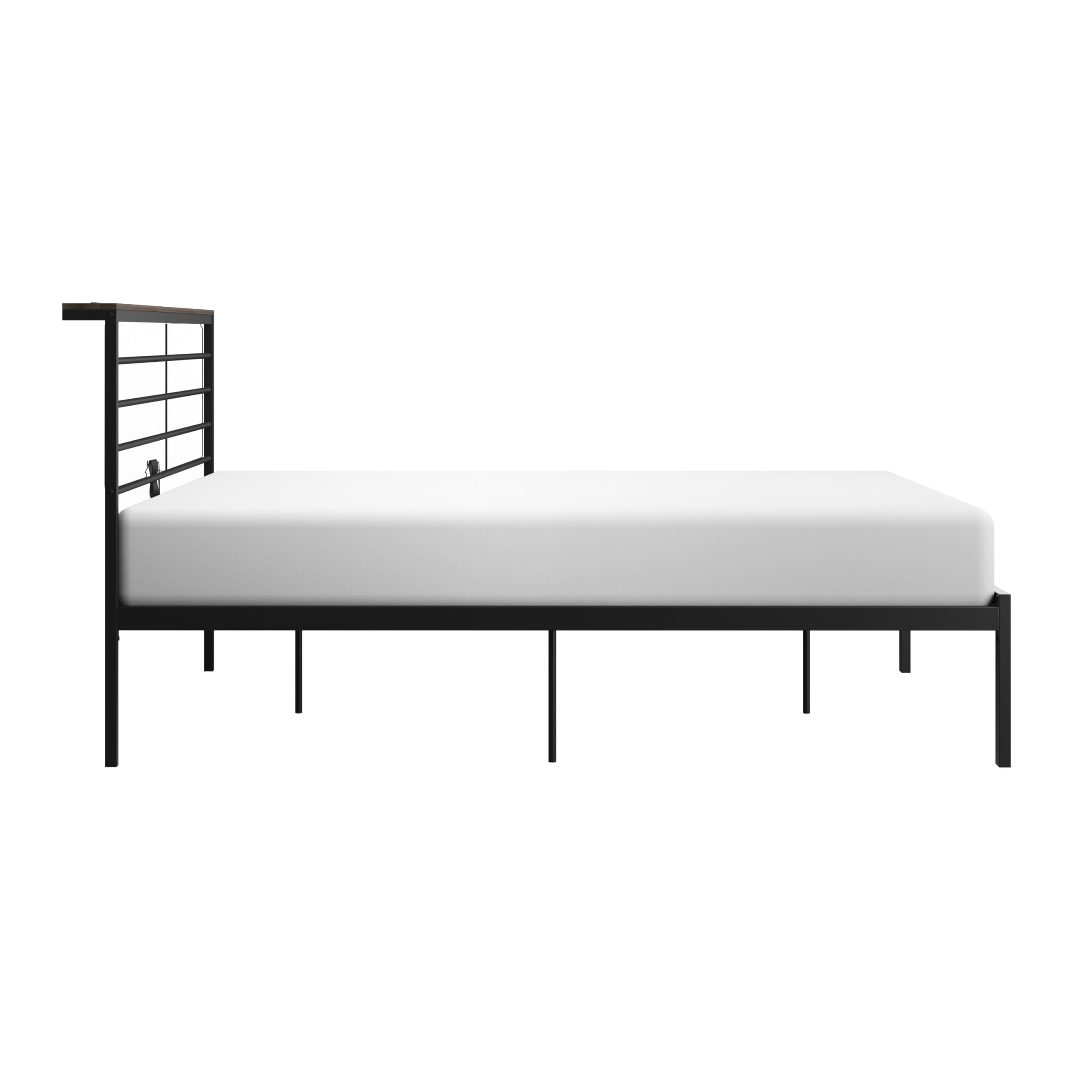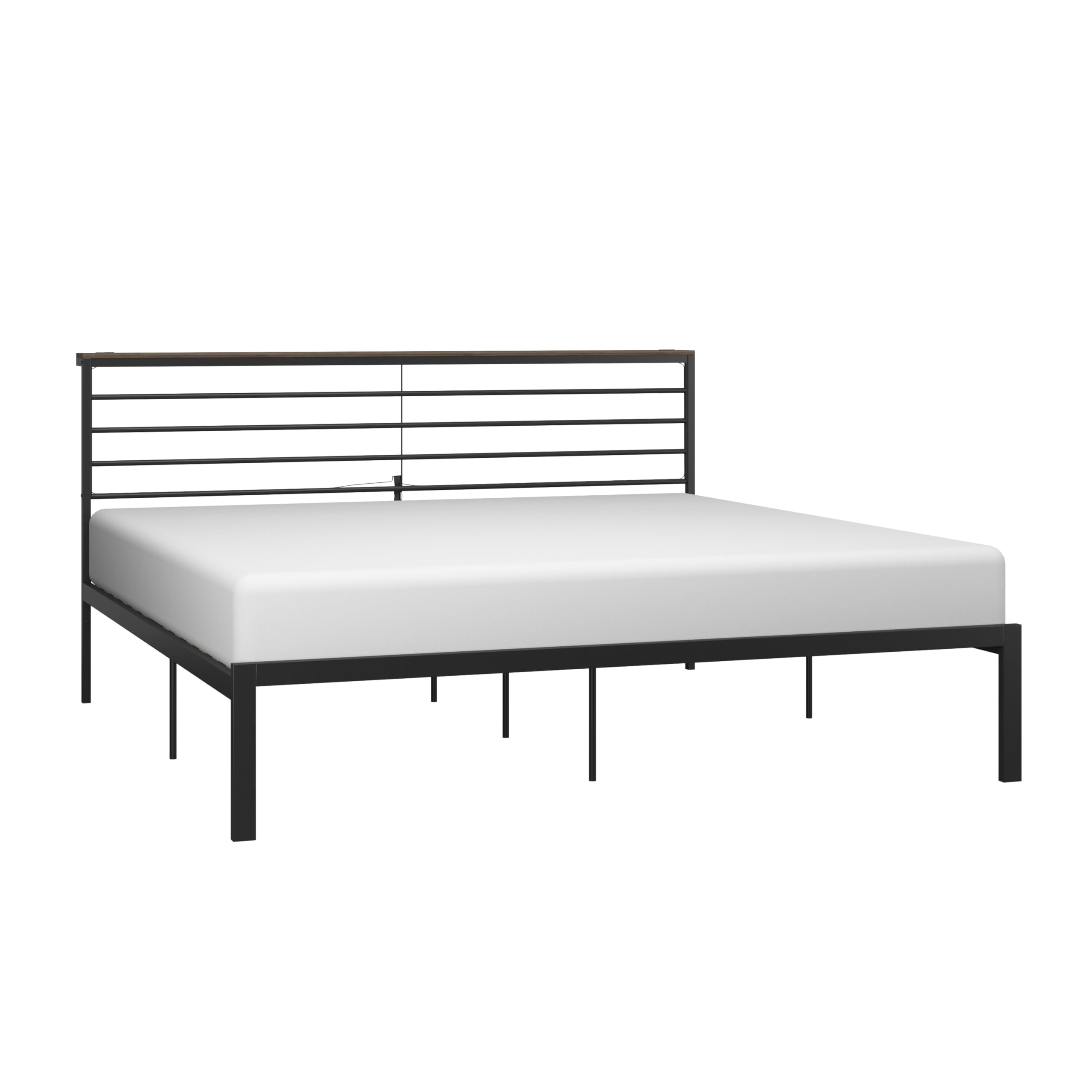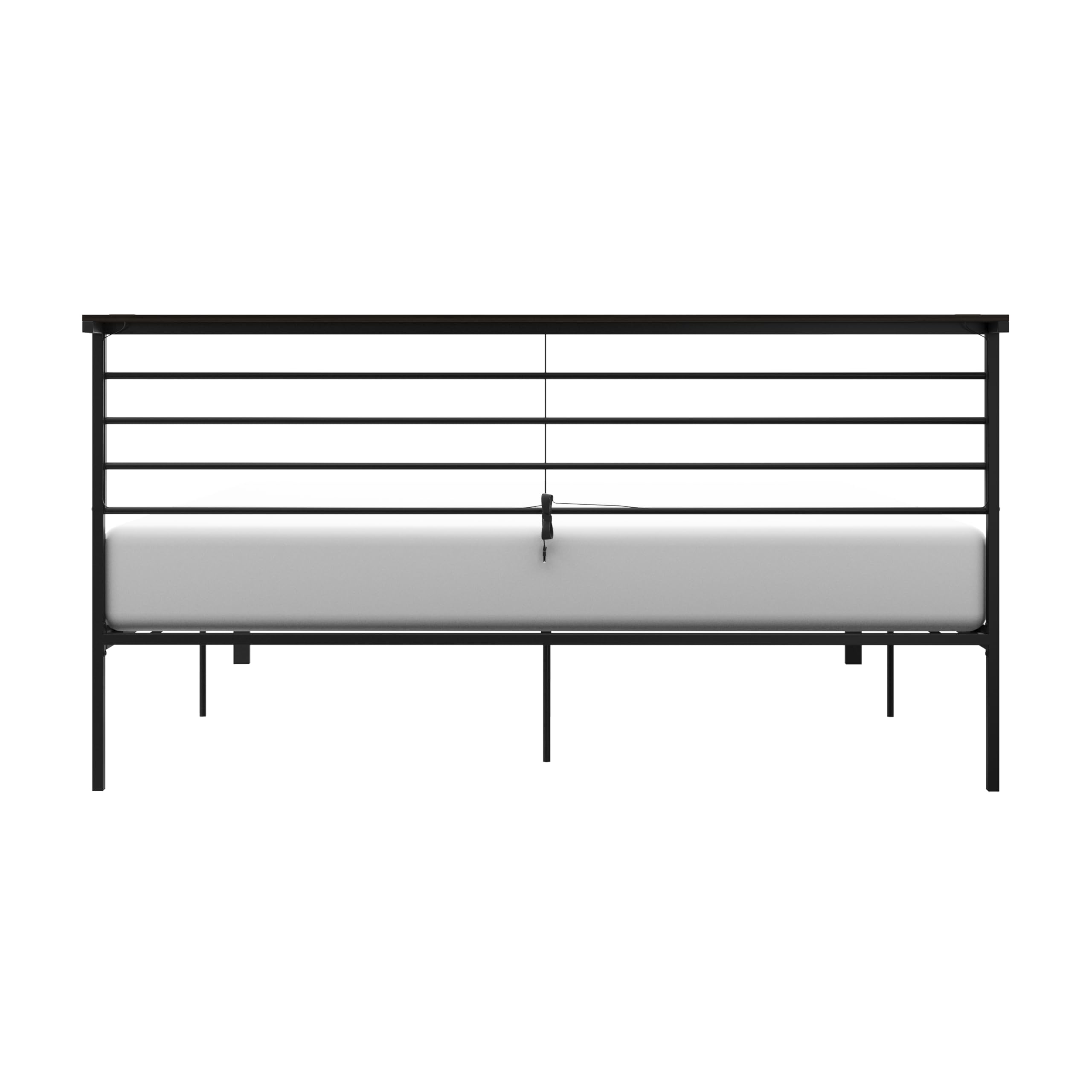 - Heavy-gauge metal construction finished in a textured black with wood trim on the top rail of the headboard