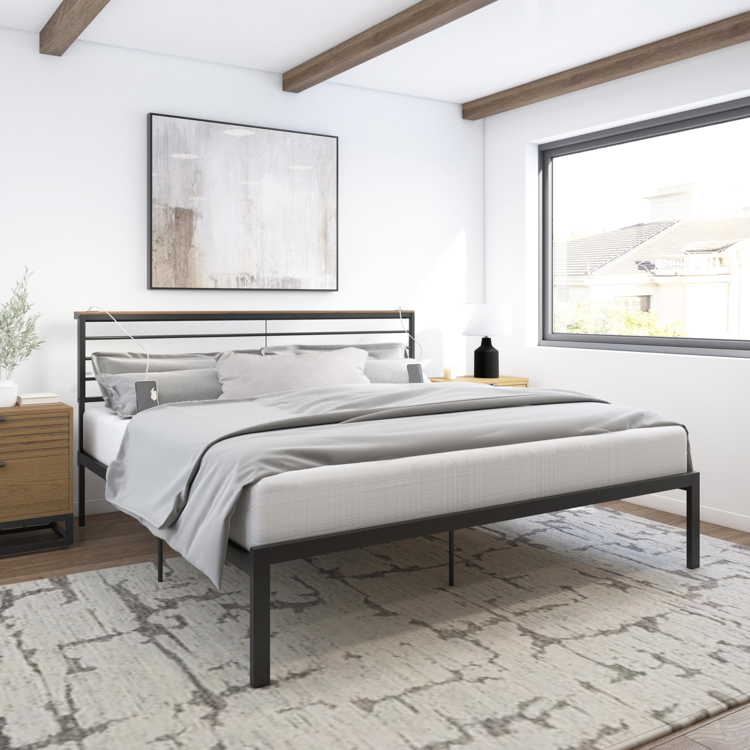 Crawford Metal King Platform Bed with USB Ports, Textured Black