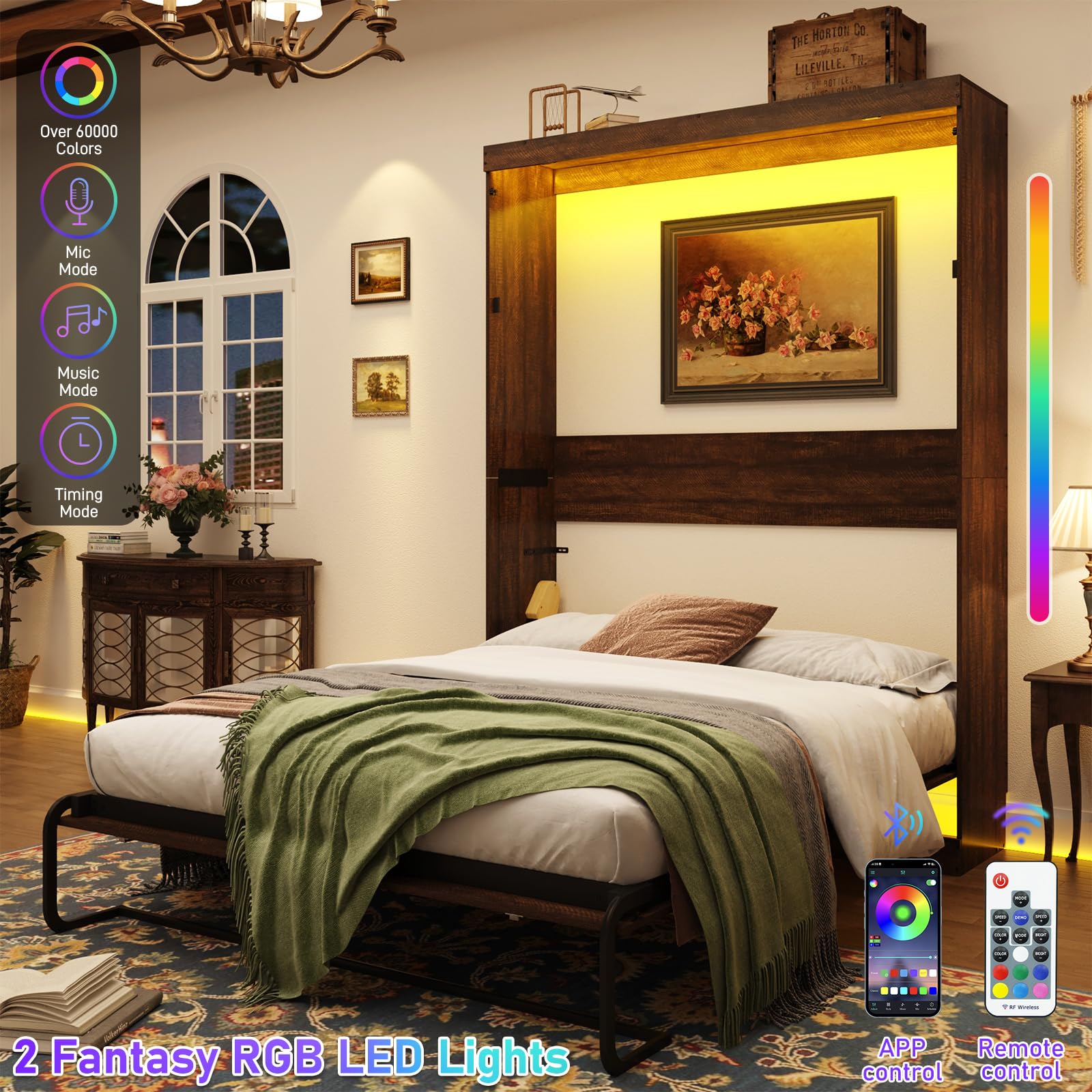 Queen Size Murphy Bed with 2 LED Lights, Farmhouse Wood Hidden Foldable