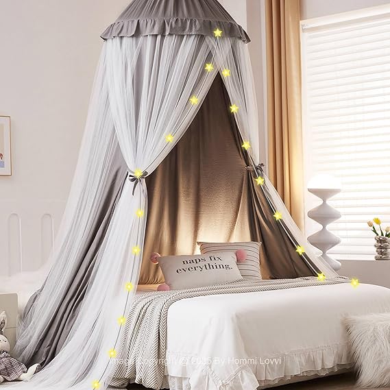 - New Dual-layer & 3-Opening Design: This girls bed canopy features a unique double-layer design. Use only the mesh layer for a breathable net cover or both layers to create excellent shade, for a cozy rest space. Featured with 3 easy openings & lovely frills dome, this kids bed canopy with the star string lights creates a romantic accent for bedroom, reading nook, and outdoor area, a ultimate play area for kids to hide, nap, meet friends, and play inside