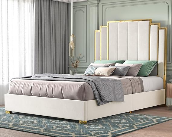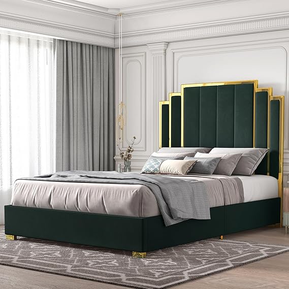 - Modern Style: Soft velvet upholstered side rails flow into 61" vertical channels headboard, supported by gold legs, king bed frame is contemporary and plush looking.