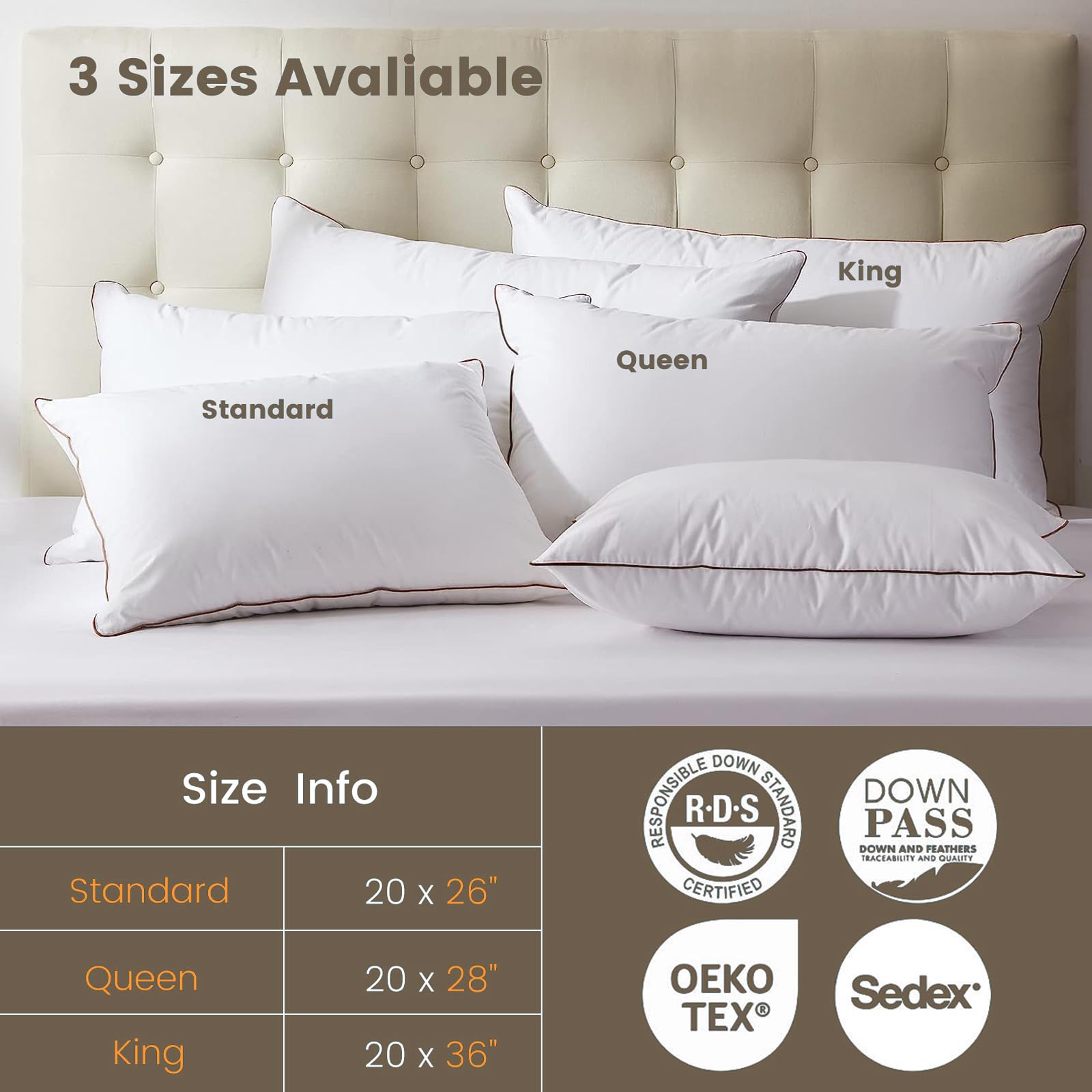 - Certified and Ethical -- All of our down pillows are certified premium quality and ethically sourced. The pillows boast excellent fluffiness, providing optimal comfort for a restful night's sleep.