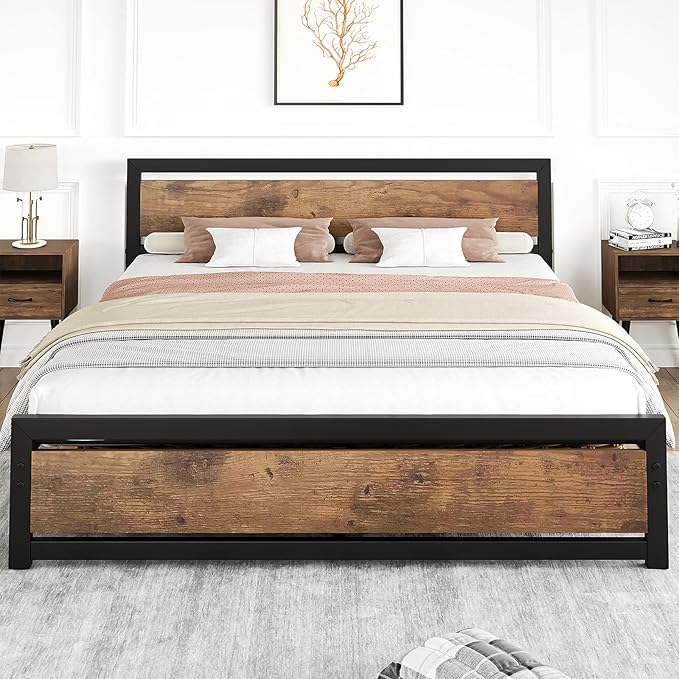 - VINTAGE HEADBOARD & FOOTBOARD - The combination of vintage MDF board & black metal bed frame takes a mild industrial look and rustic style, without being overly trendy. Very suitable for your house style. This retro bed frame king size is a sleek finishing touch to your bedroom