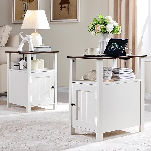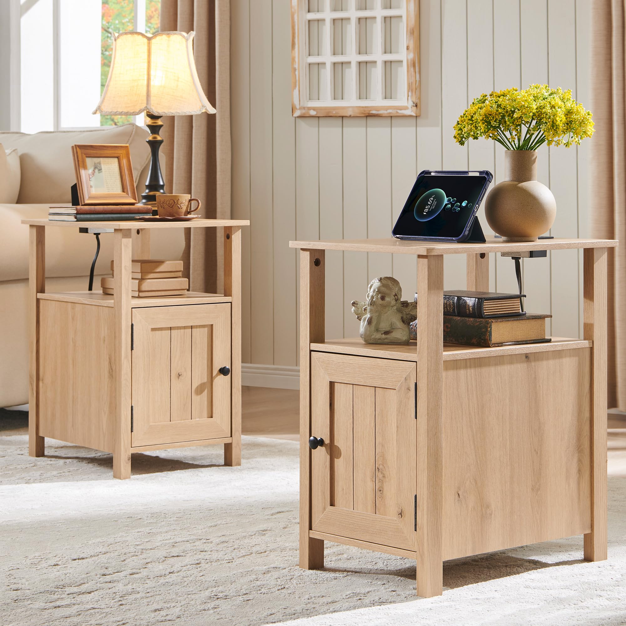 Farmhouse Nightstand Set of 2, End Table with Charging Station