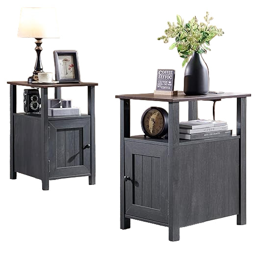 - This side table with charging station that will power your smartphone, tablet, desk lamp, and more. Each side table has two USB ports and an AC outlet on the top. Keep your electronic devices charged as well as within reach.Groove barn doors and clean lines add texture to your space, seamlessly blending modern and rustic styles. Sturdy support legs with table foot pads at the bottom to prevent scratching your floors.