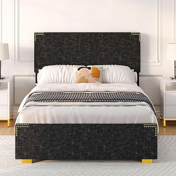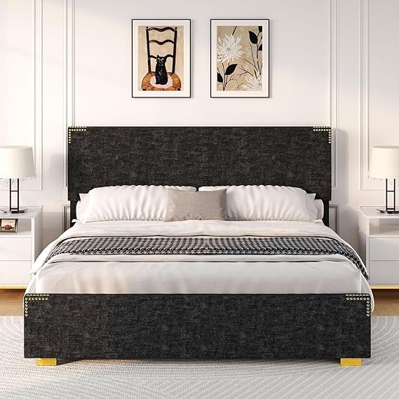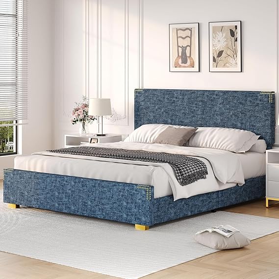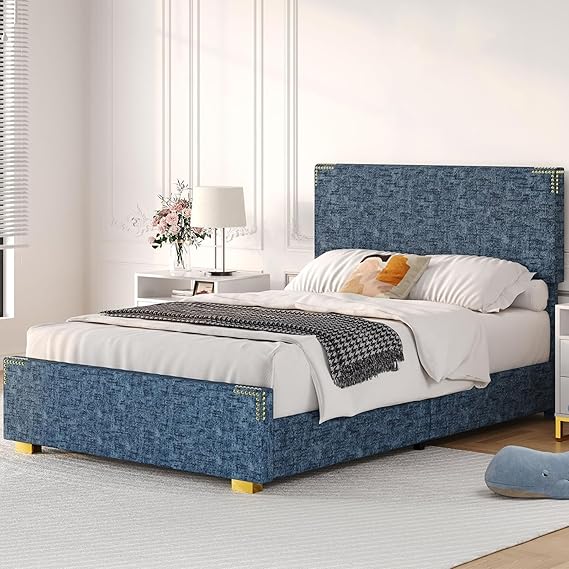 - Elegant design: Twin size bed frame with headboard is made of soft and cozy chenille fabric, blue denim texture and gold rivets add a unique texture, that merges comfort and character, to make your bedroom unique