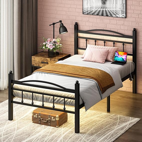 Full Size Bed Frame with Headboard, Metal Platform Bed Frame with Charging Station