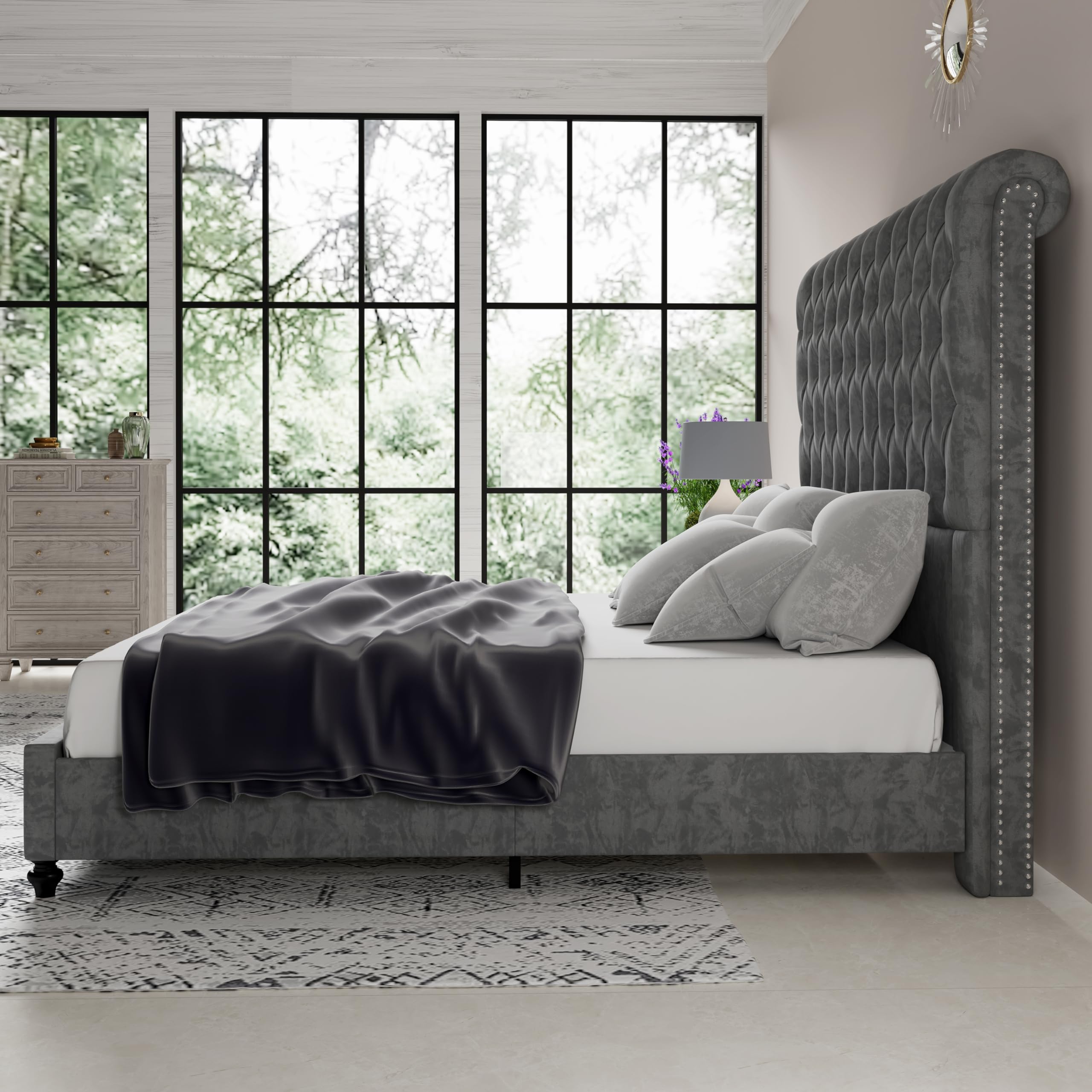 - Elevate your space with a high-back sleigh bed—plush rolled edges, chic studs, and smooth curves create a touch of luxury that transforms your whole home.