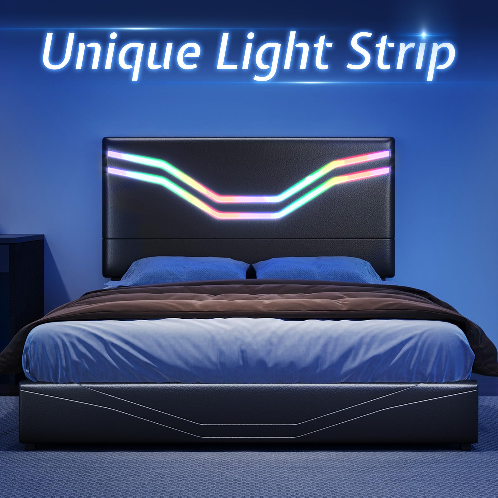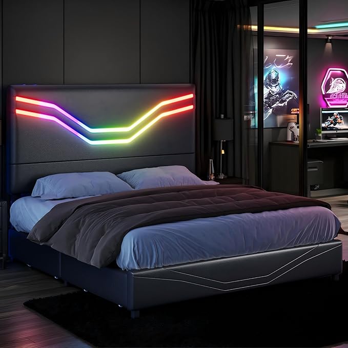 - Customizable LED Lighting, App + Remote: This LED bed frame queen size features built-in RGB light strips with 20+ color modes, brightness control, music sync, and timers. Control it via app or remote to transform your bedroom into a tech-inspired space.