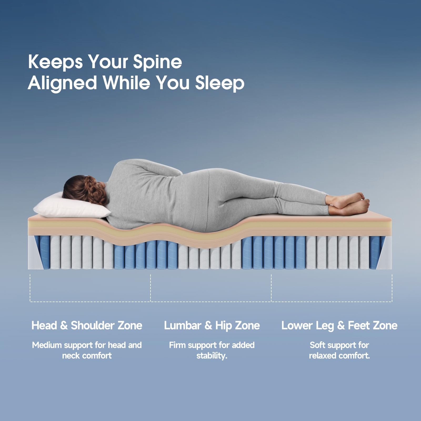 - DUAL SUPPORT DESIGN:The KauRelax 12 inch king size hybrid mattress combines gel memory foam, pressure-relief comfort foam, and zoned pocket coils with varying firmness to dynamically support your sleep posture and keep your spine aligned.