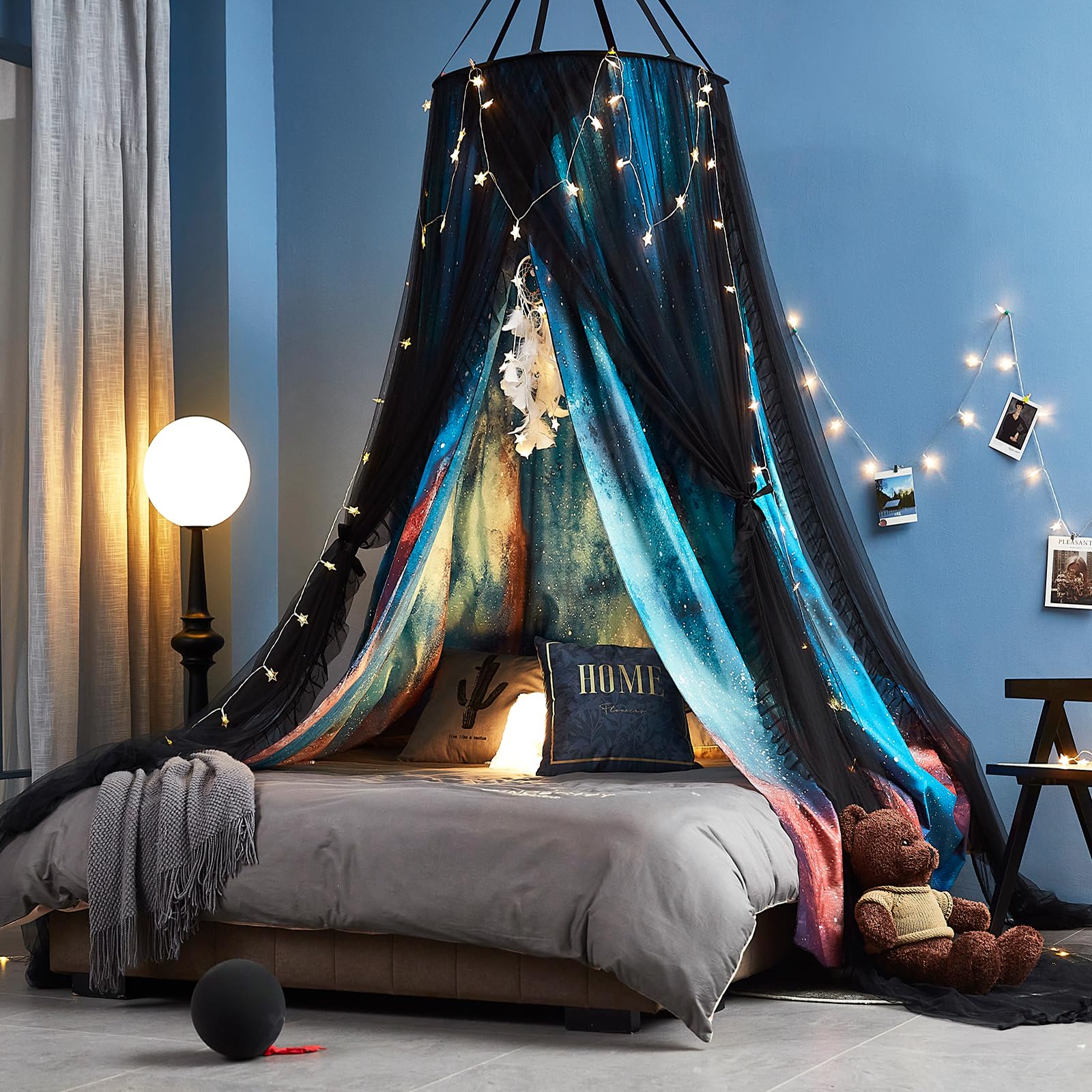 - This exquisite bed canopy offers kids a fantasy castle to have fun inside. The galaxy pattern print is full of artistic and romantic colors, stimulate your child's imagination and creativity well. The canopy for kids room offers children a castle, a club and a secret garden, a personal space with their friends. Charming print canopy bed curtains make your bedroom full of energy. Unexceptionable gifts for kids, friends, family.