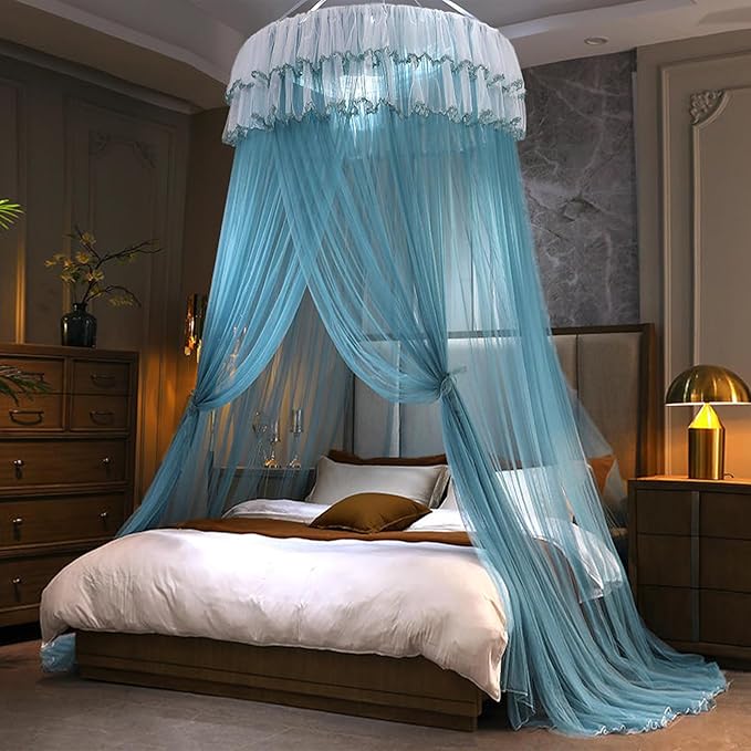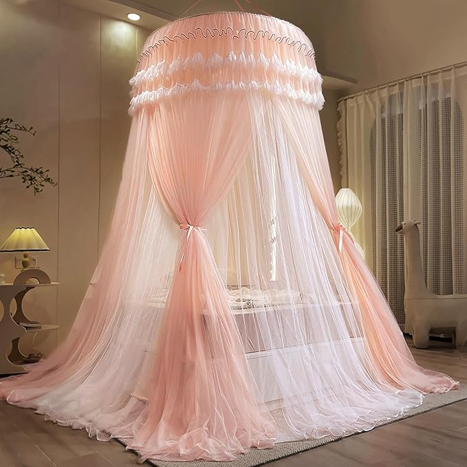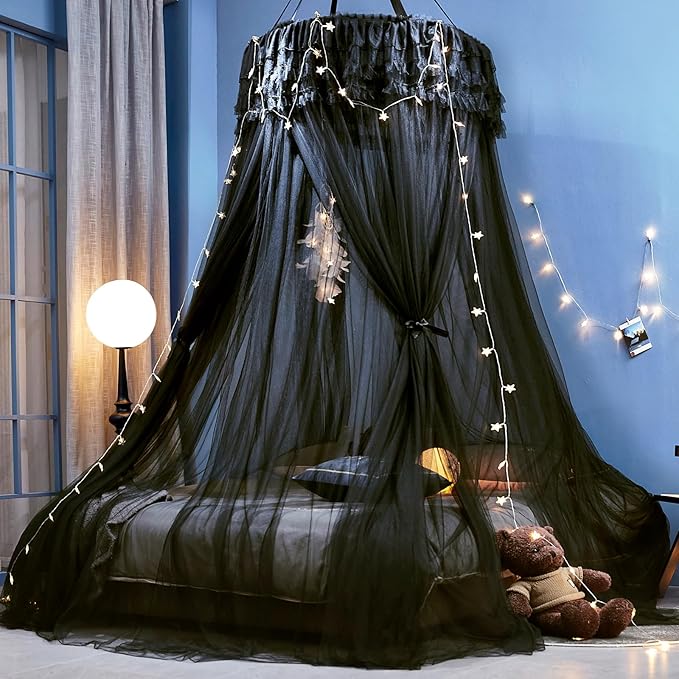 - This bed netting canopy for girl room has a round dome and bright colors, pink / white / black / blue, making it an exquisite decorative accessory. You can also hang some night lights and dream catchers on top of the mosquito nets, put on blankets and pillows to make the overall more wonderful. It is very suitable for baby cradle, crib, toddler bed, play area mat, carpet, outdoor playhouse.
