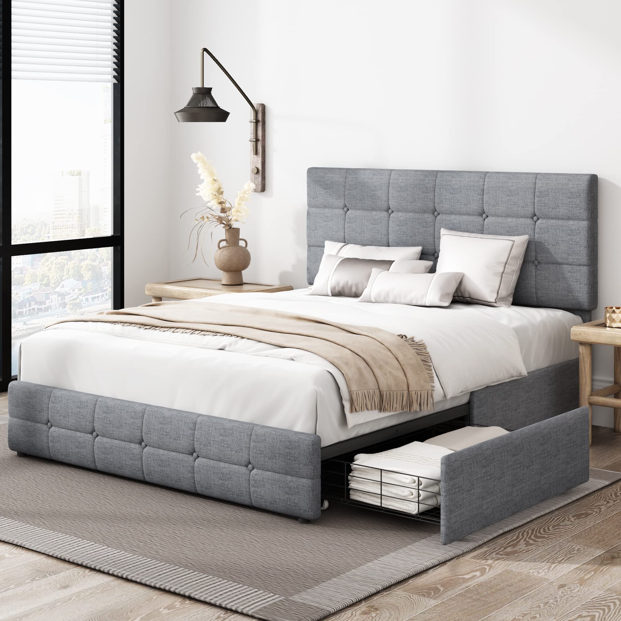 - Bed Frame with Drawer: Underneath the bed frame with four storage drawers to store your seasonal beddings and linens and a host of other personal essentials. The drawers are set on wheels for easy access sliding in and out.