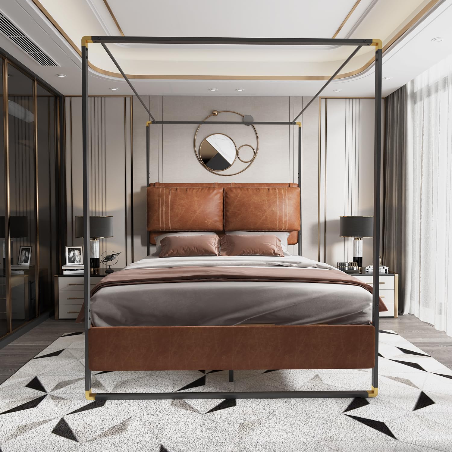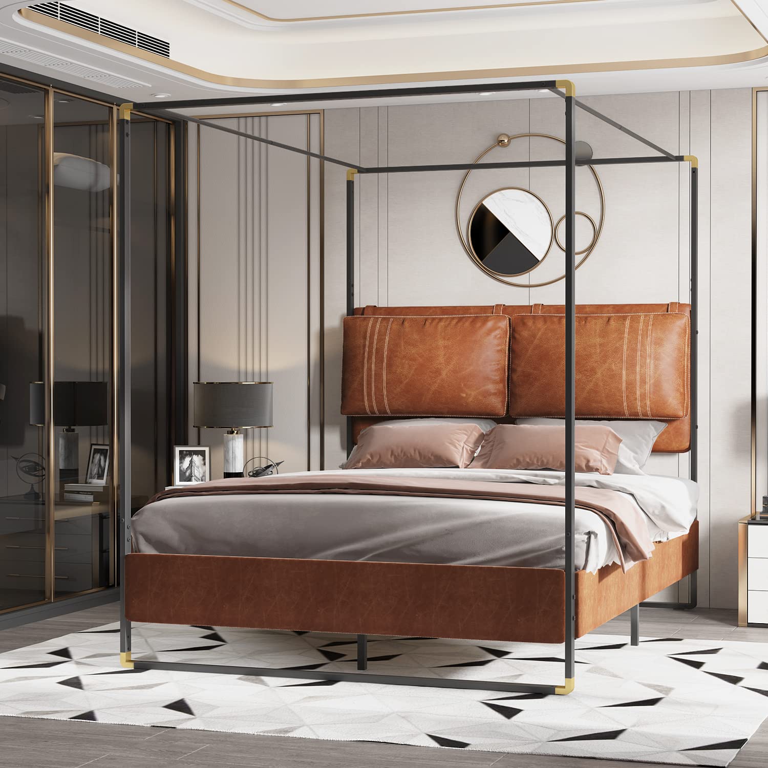 King Upholstered Canopy Bed Frame, 4-Post Canopy Bed with Headboard, 2 Cushions