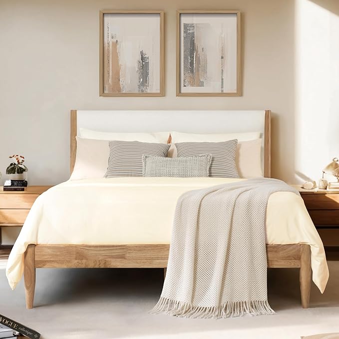 - NATURAL BEAUTY & ELEGANT DESIGN: The mid-century bed frame combines the beauty of natural wood grain with modern simplicity. The headboard is wrapped in Supersoft, durable fabric with a subtle weave, easy to clean, and the natural hue of cotton ball fabric creates a warm, gentle atmosphere. You can also choose to pair it with one of our matching nightstands to give your room a new look.