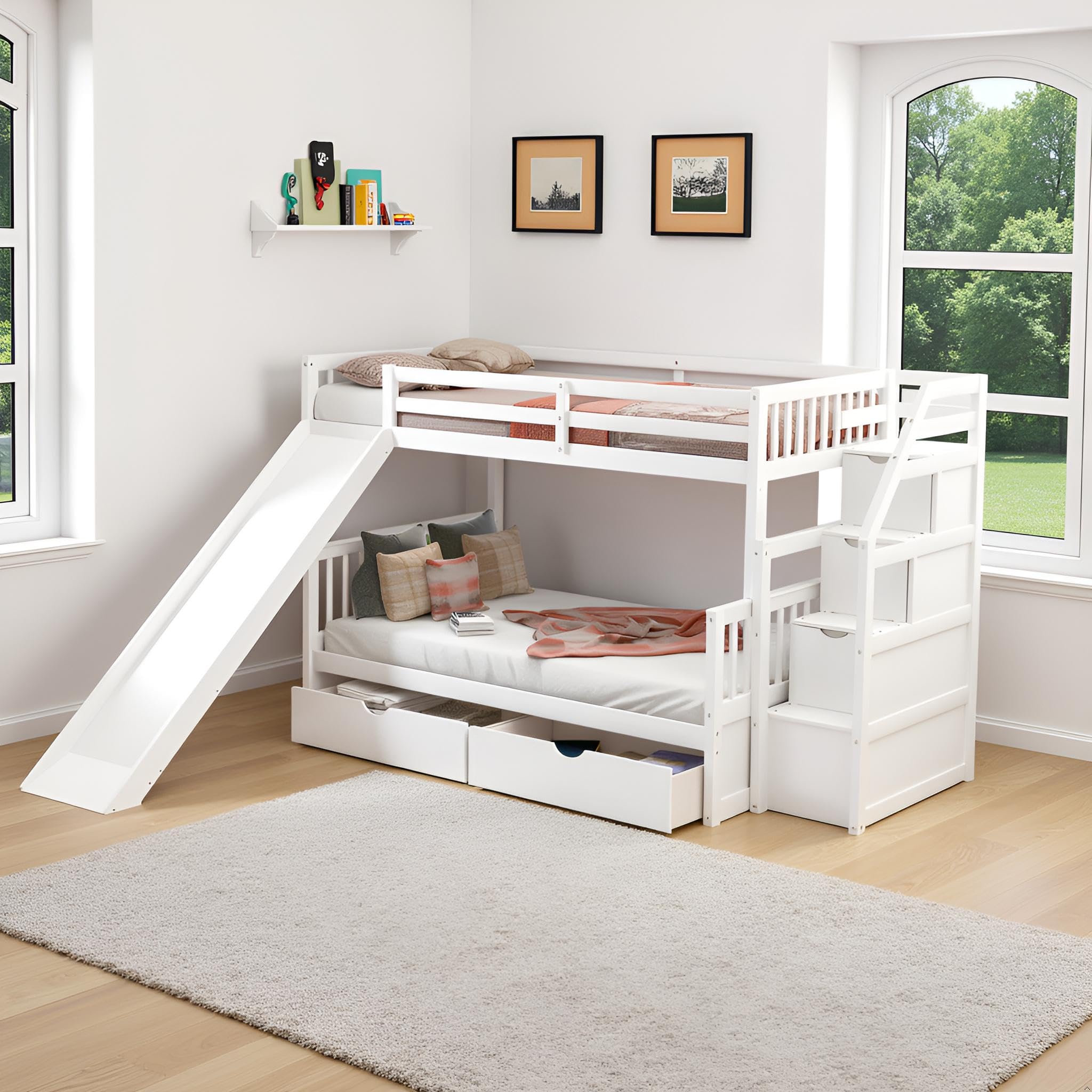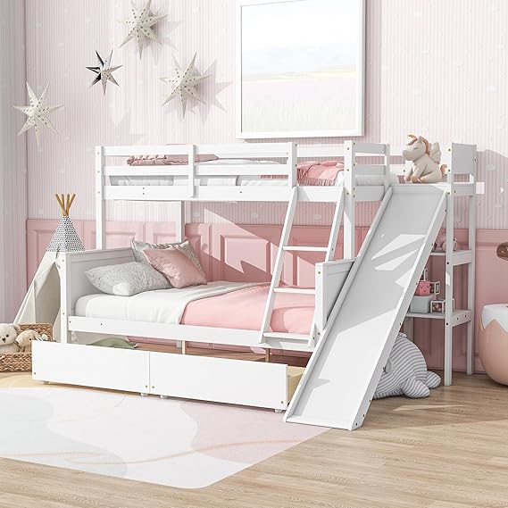- Smart Storage Twin Over Full Size Bunk Bed with Slide: Maximize your room's potential with this twin over full size bunk bed with slide featuring multiple storage solutions. The under bed drawers and great ladder storage grids offer good space saving options for toys, books, and bedding, keeping your kids' room tidy and organized.