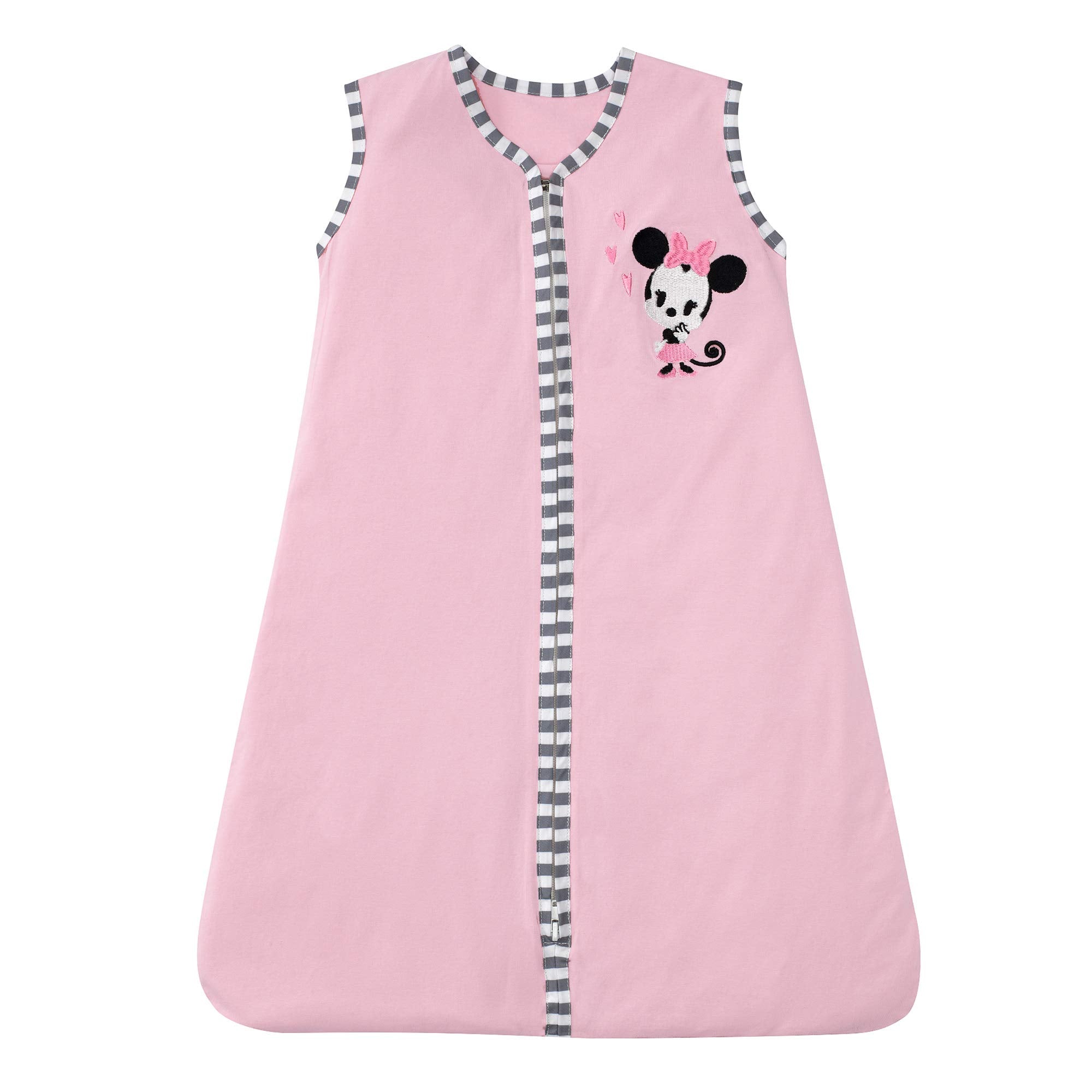 - Pink 100% cotton jersey wearable blanket, which is recommended for safe sleep, features Minnie Mouse in the upper right-hand corner