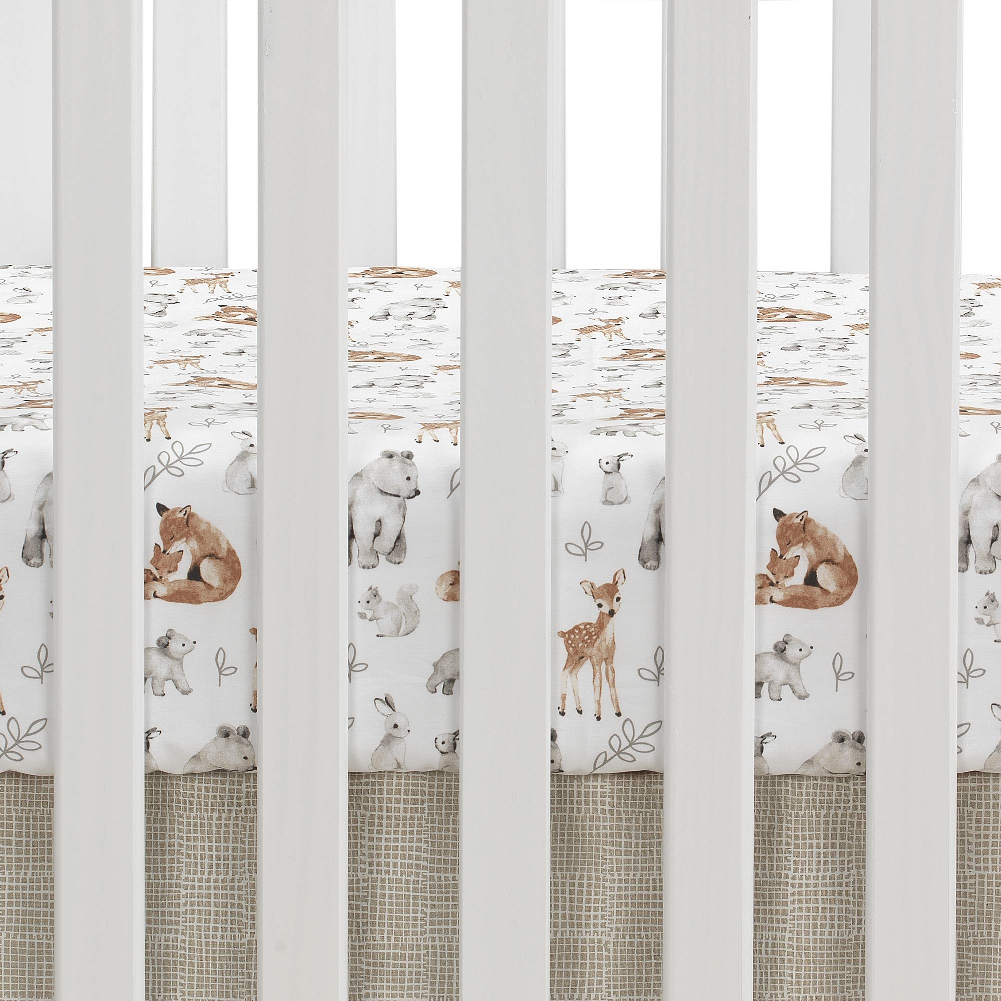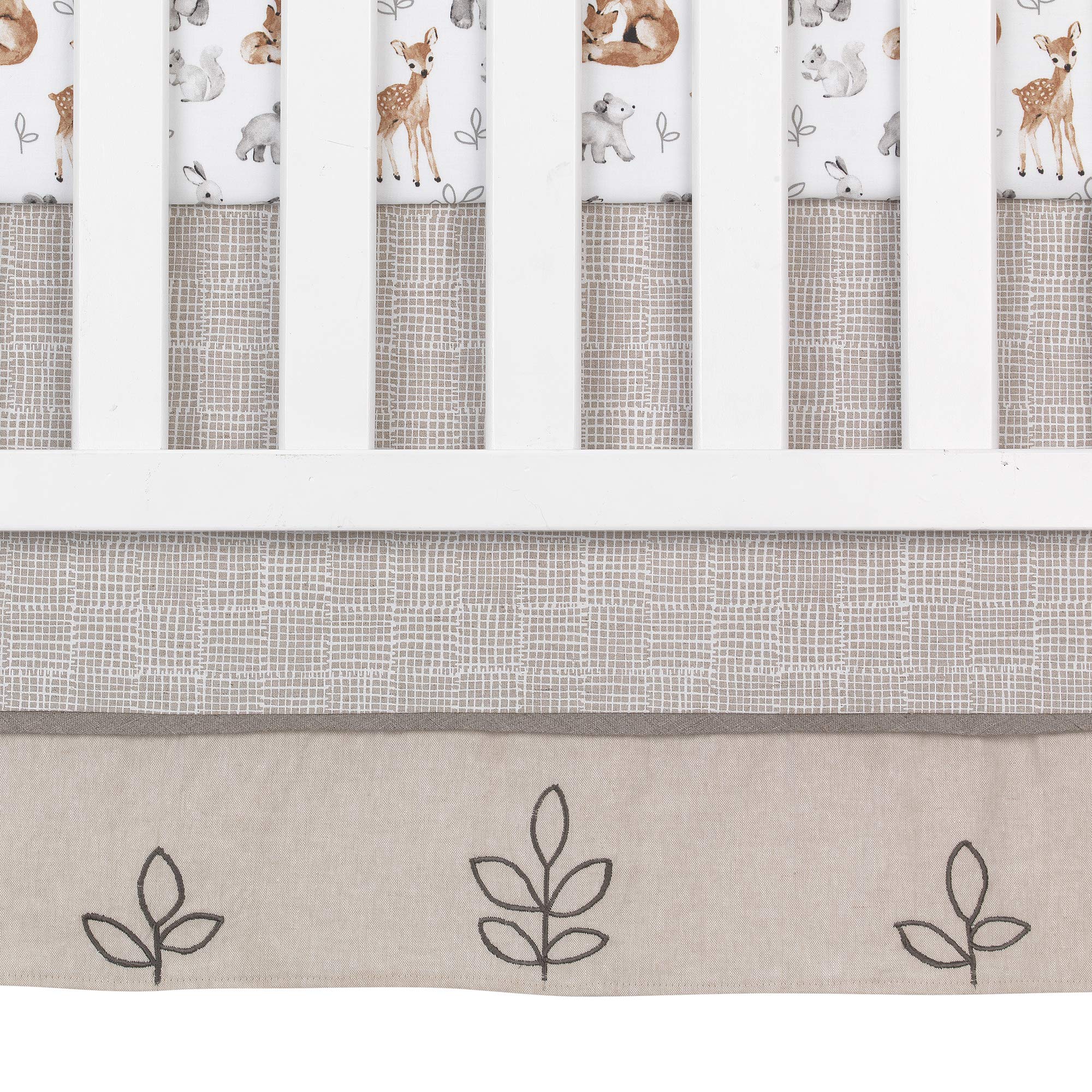 - An embroidered leaf design is featured on the front of the crib skirt and the cotton fitted crib sheet features sweet watercolor forest animals