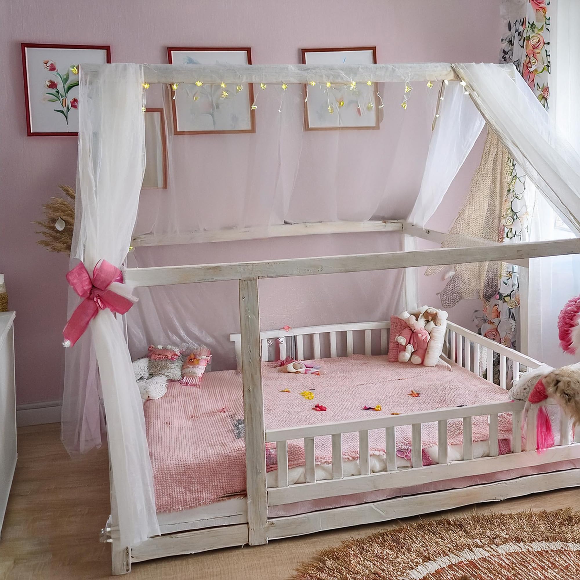 - The material of bed canopy is polyester,size is 39.4"W x 315"L each curtain. This white canopy curtain is suitable for all bed sizes.Pls check you bed or bed frame dimension before you buy.You could use for metal/wood bed frame, house bed, carrige bed. Put in baby nursery room,girls bedroom,boho/princess style room,etc.