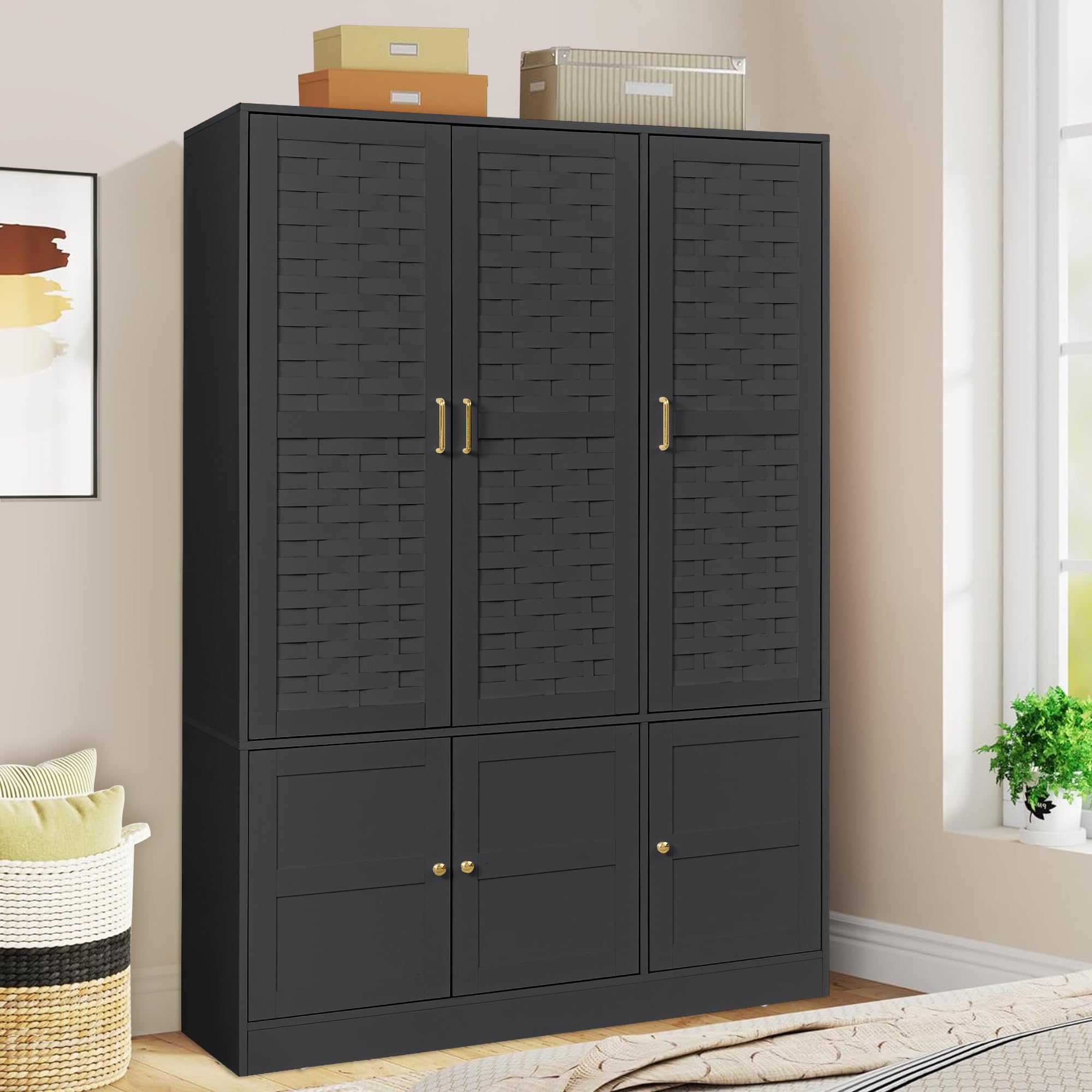 LEVNARY Wardrobe Closet with 6 Woven Doors, Walnut Armoire Wardrobe Cabinet for High Storage Capacity with Adjustable Shelves and Hanging Rail, Freestanding Tall Bedroom Closet (Black)