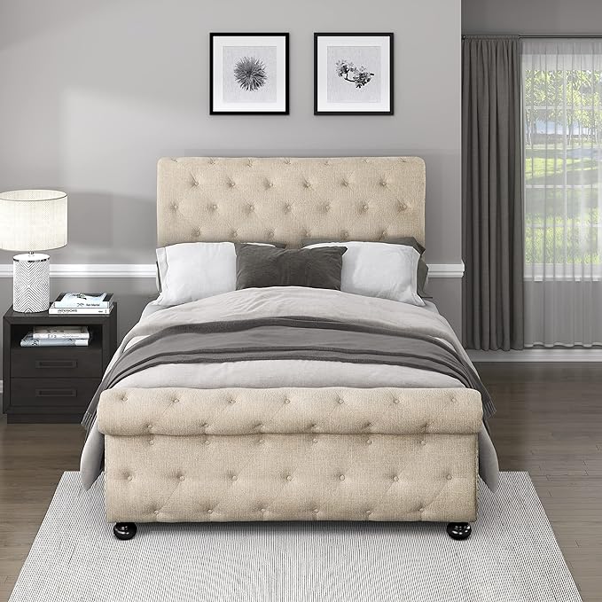 - Rolled Headboard and Footboard + Nailhead Trim + Button Tufting