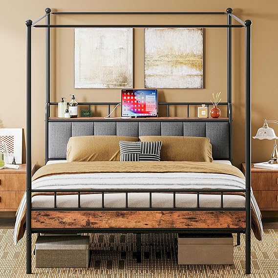 Canopy Bed Frame King, Storage Headboard with Charging Station, Platform Bed