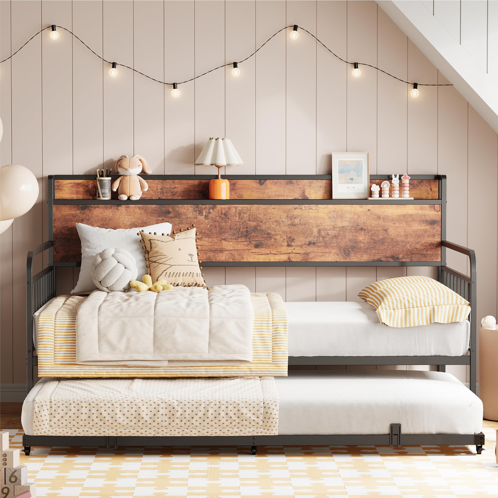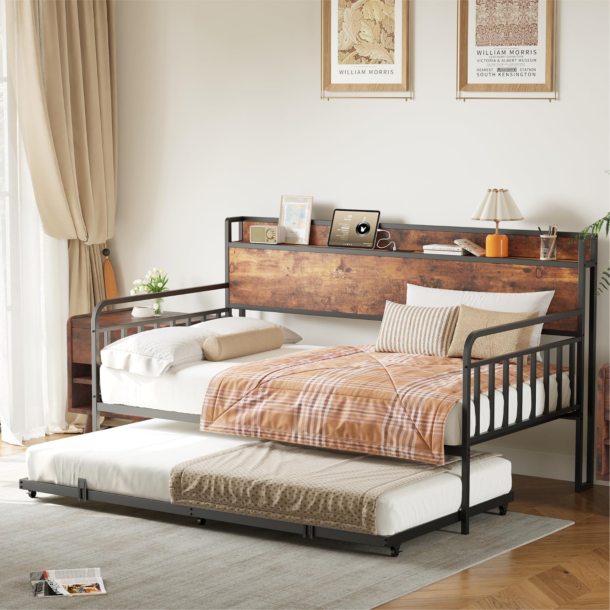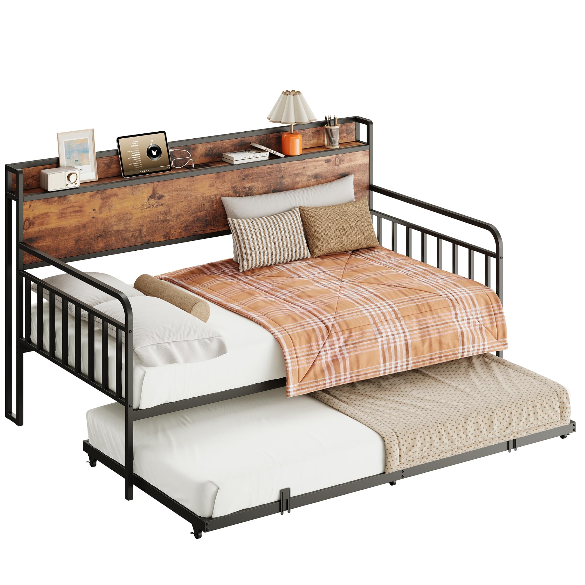 Daybed with Trundle, Twin Bed Frame with Storage Headboard and Charging