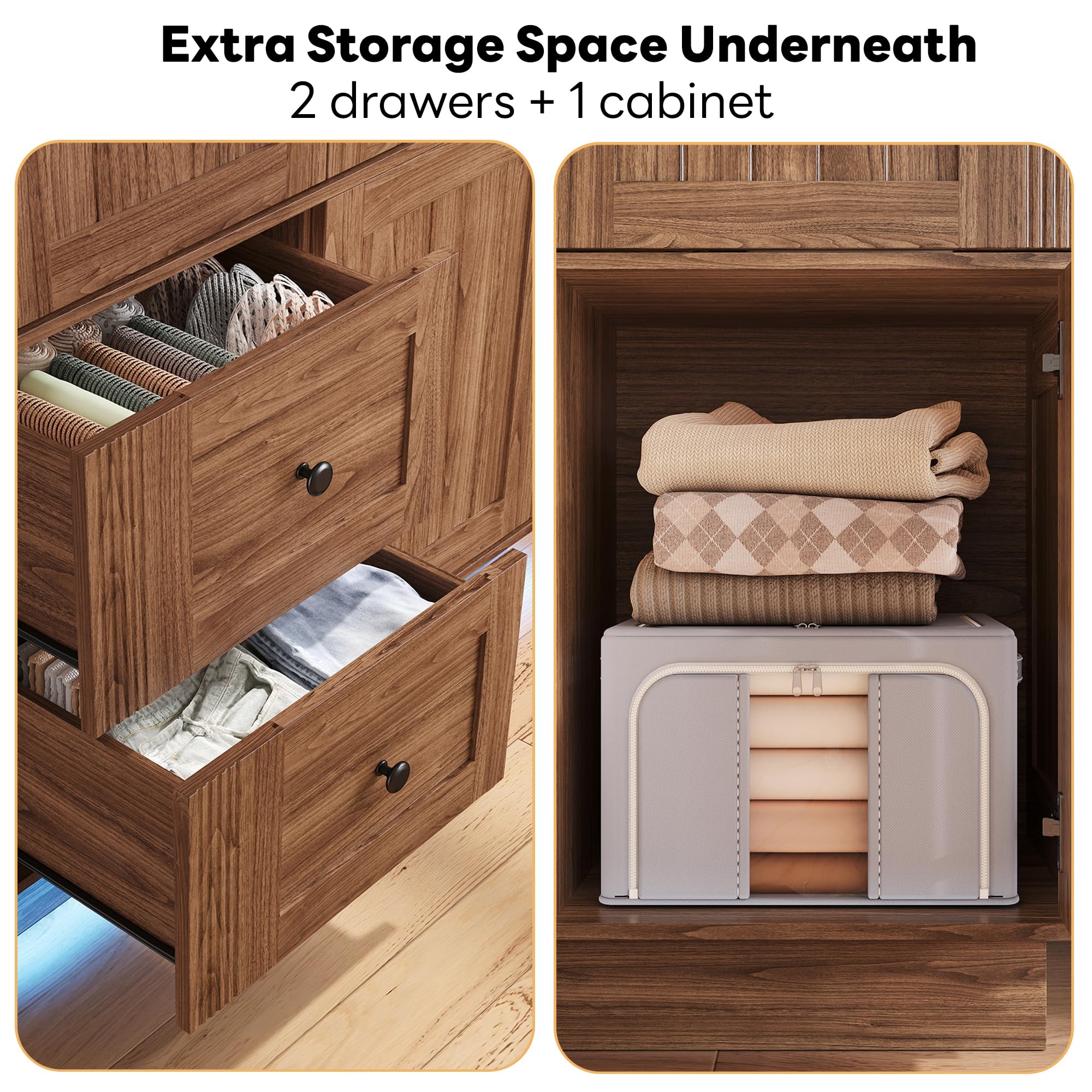 - Stylish Farmhouse Design:Crafted with vertical slatted panels, clean lines, and classic molding, it blends rustic elegance with modern utility. The matte black metal handles add a bold contrast to the rich wood finish, making this wardrobe closet a statement piece in any space.