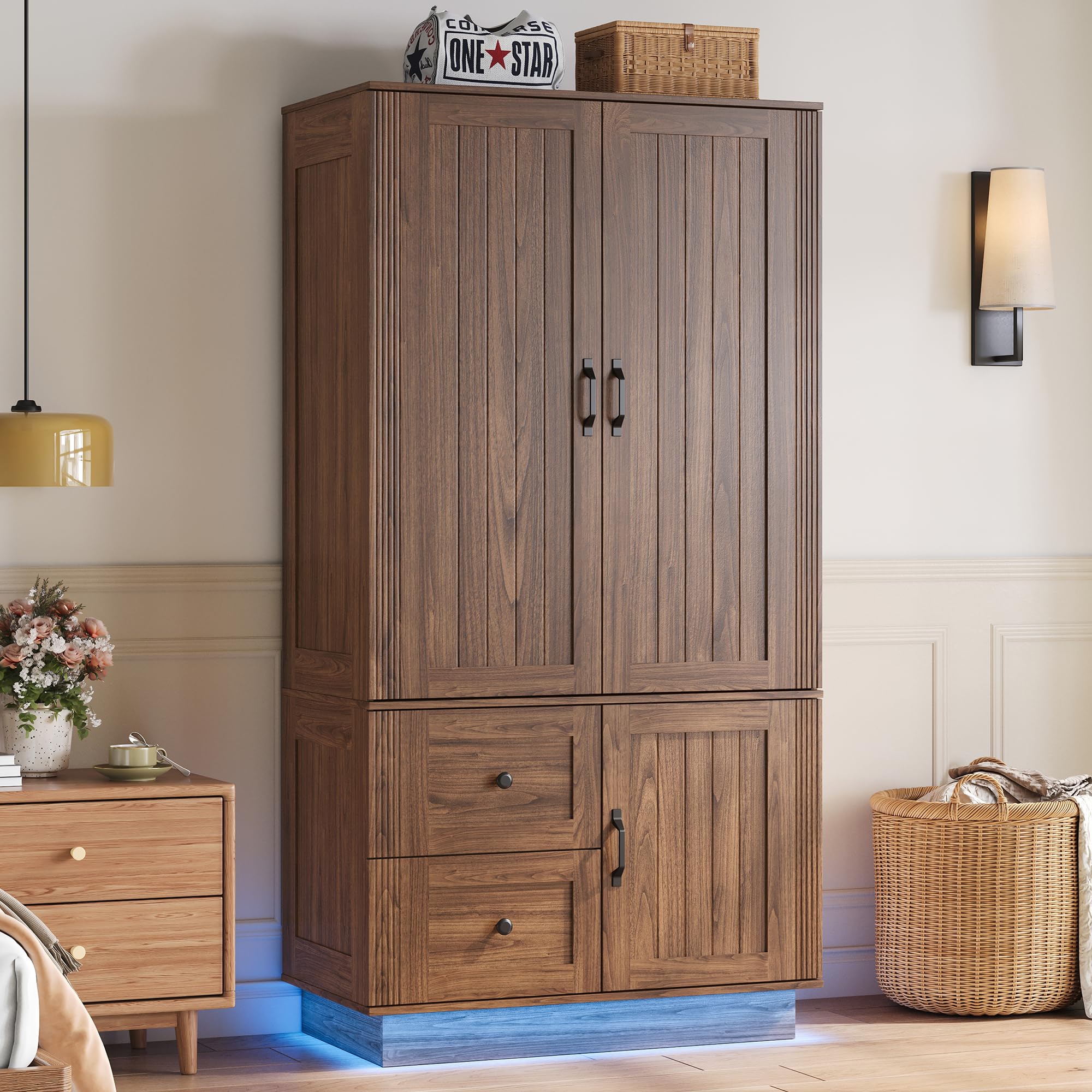 - LED Lighting For Ambience: Our bedroom armoire base has built-in LED lighting. Switch settings via mobile app or remote control to customize colors, set timers, and activate music sync mode. Vibrant lighting effects can create a cozy, romantic or playful atmosphere.
