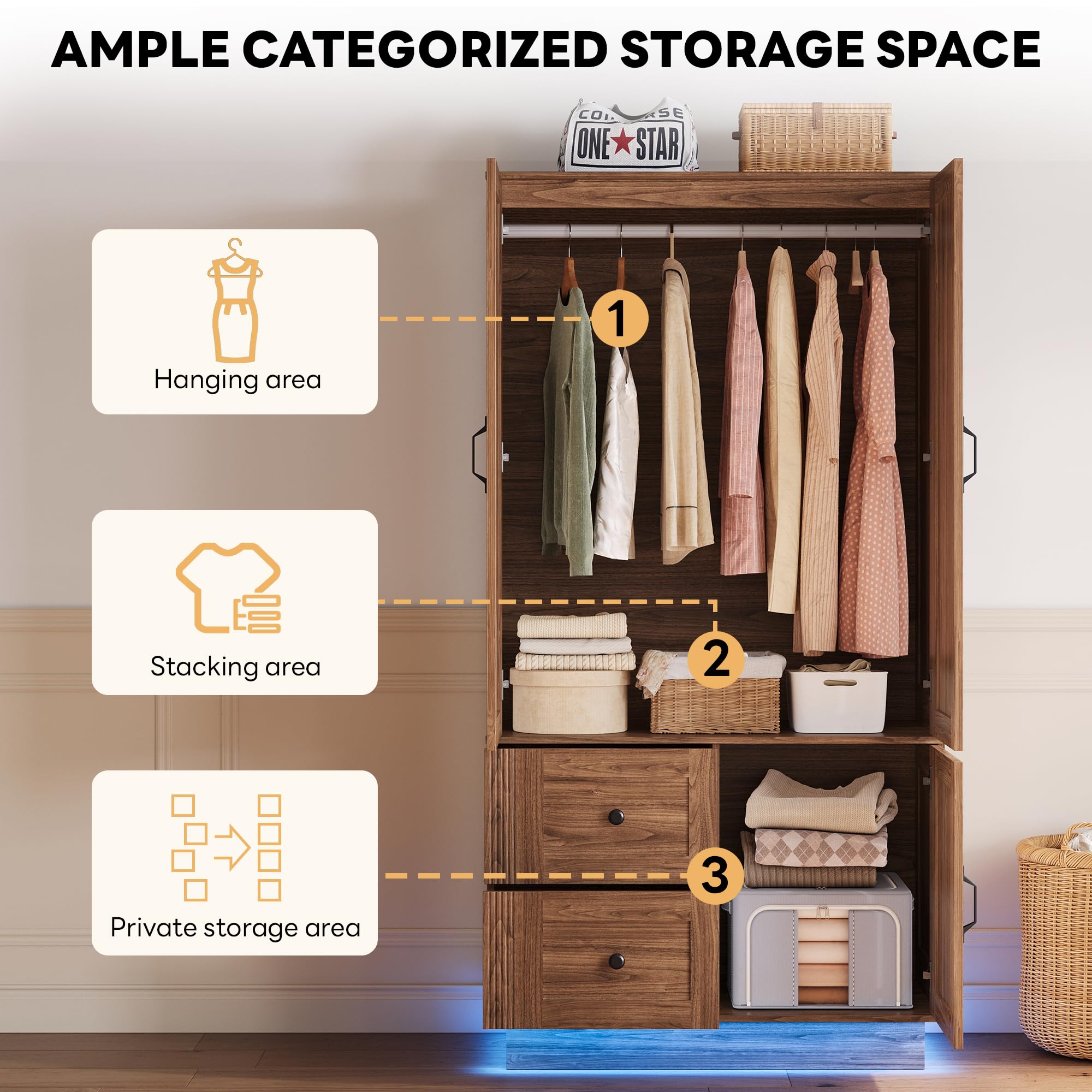 - Spacious Wardrobe Storage:Designed to maximize your organization, this armoire wardrobe closet includes a full-length hanging rod behind the double doors for dresses, coats, or suits. 2 drawers and 1 lower closet cabinet offer extra room for folded clothes and accessories.