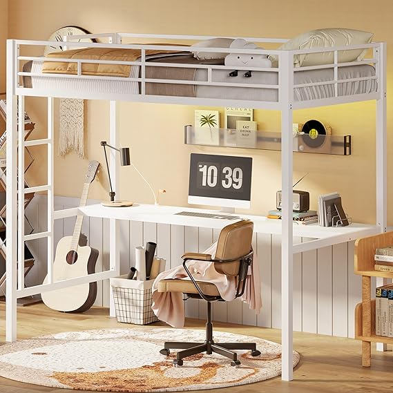 Loft Bed Twin Size with Desk, Metal Loft Bed Frame with Power Outlet
