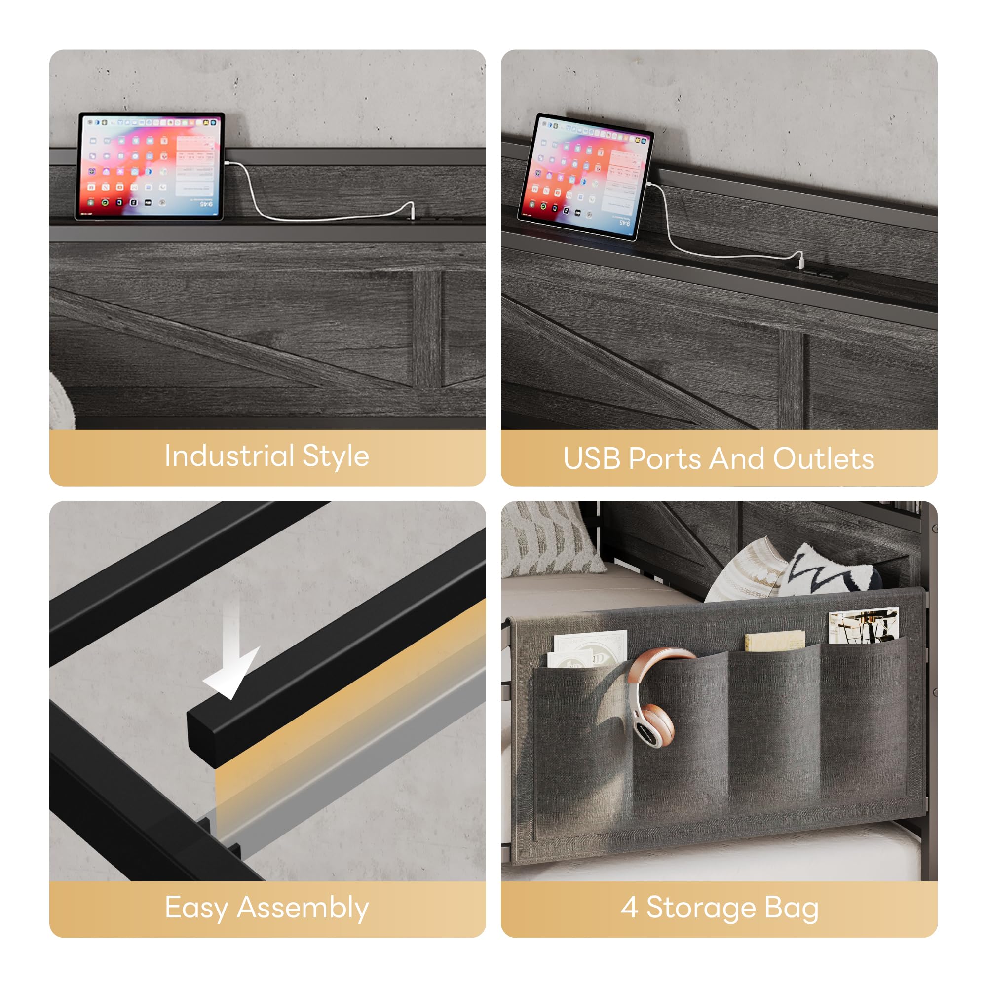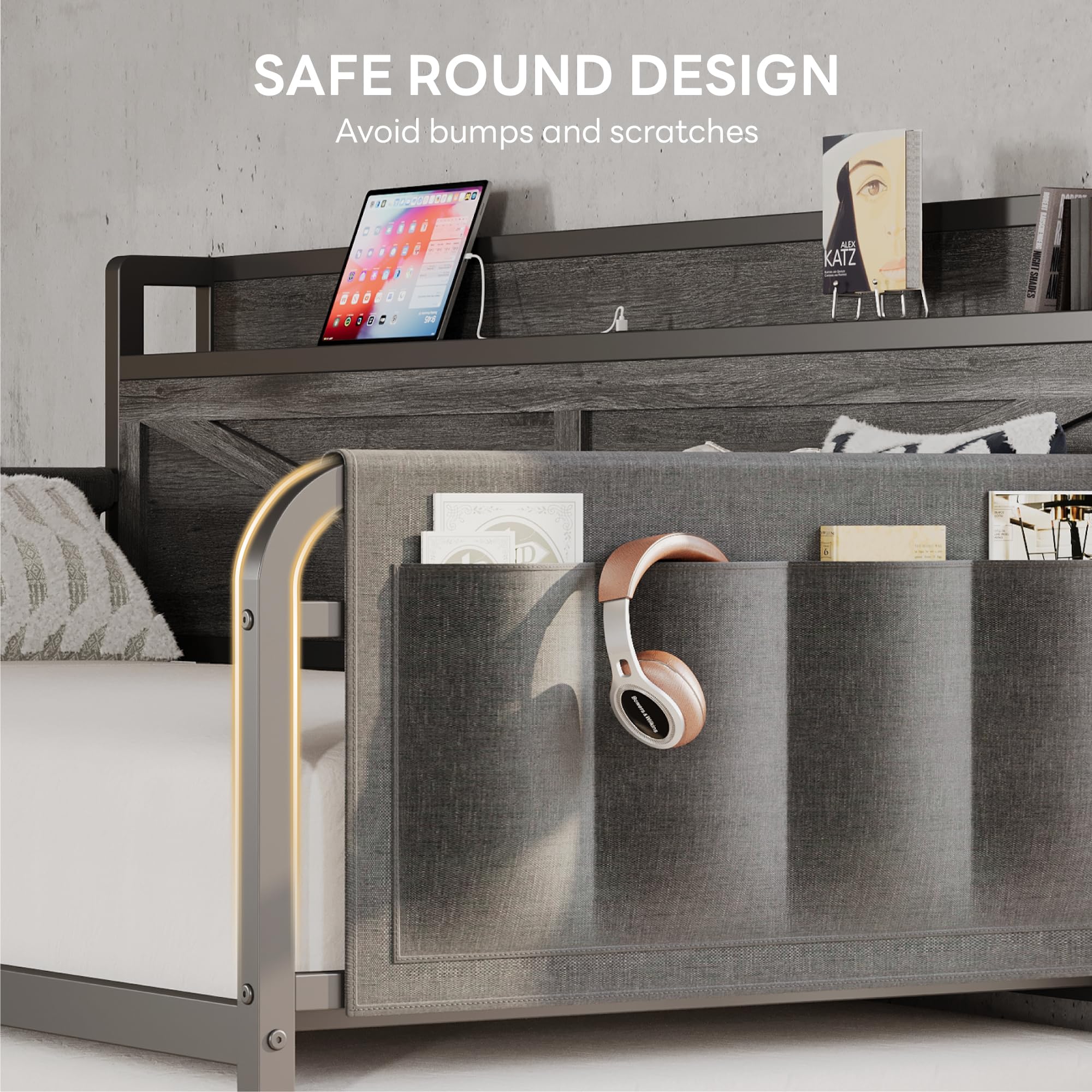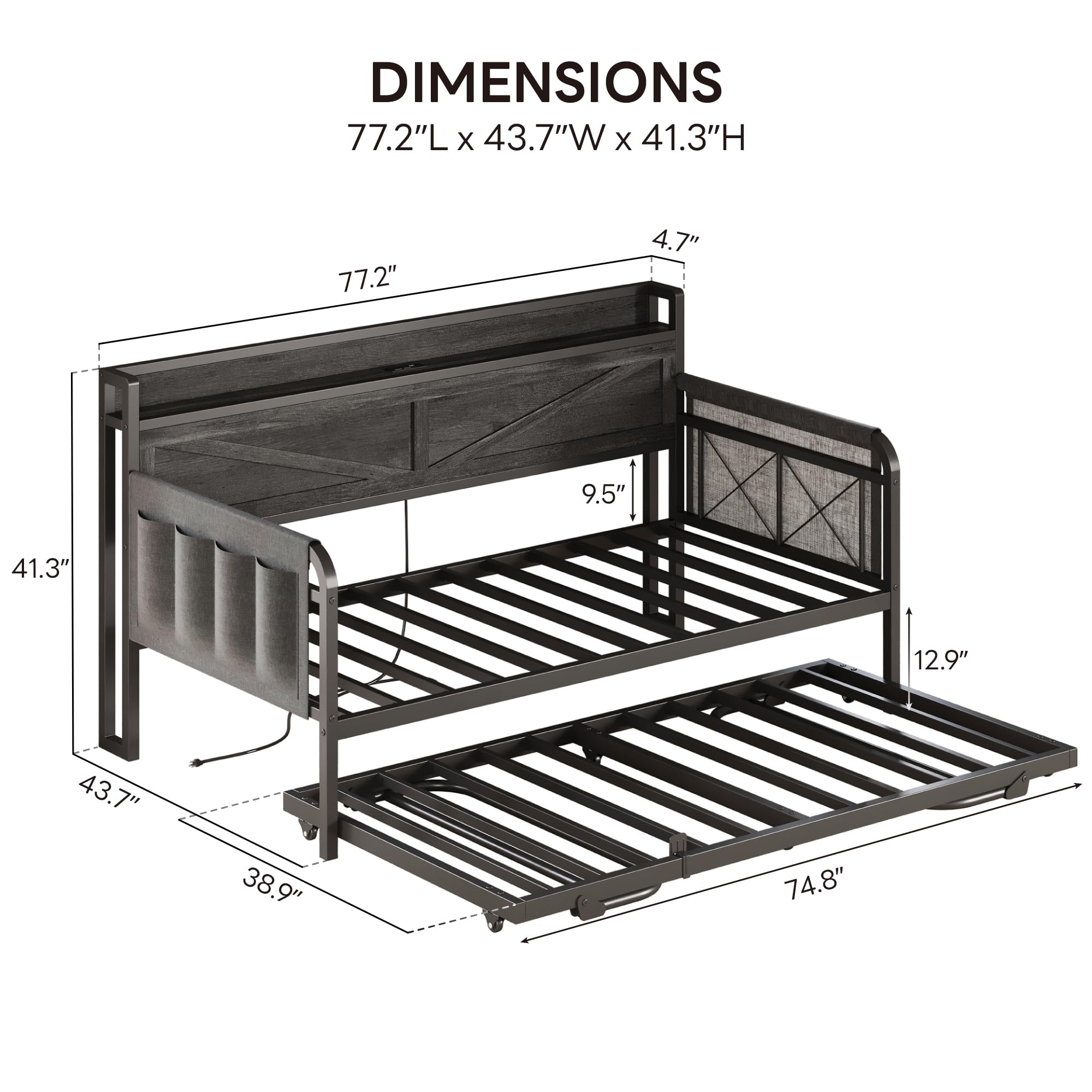 LIKIMIO Twin Daybed with Trundle Bed, Storage Headboard with Charging Station, Sofa Day Bed with Strong Supports for Living Room, Bedroom, and Guest Room, Charcoal Grey